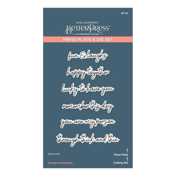 Friends Sentiments Press Plate & Die Set is part of the Storytelling by Spellbinders Scrapbooking Collection. Impress the entire plate full of everything that surrounds friends in sentiments and phrases on a sweet lowercase script font. Its matching thin metal cutting die will cut all at the same time. A great time saver! Use one and keep the others for another project or use them all up. Ink the plates with the BetterPress Ink to be pressed against the BetterPress Cotton Card Panel and Sheets for a crisp letterpress design.