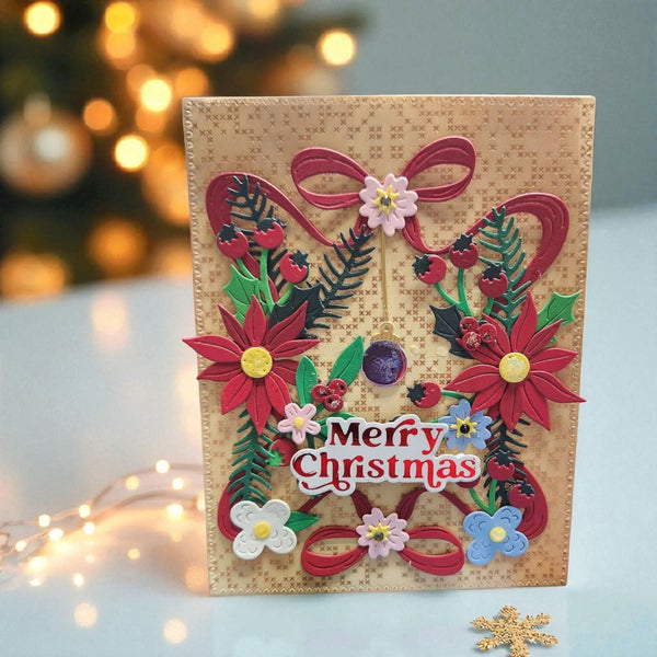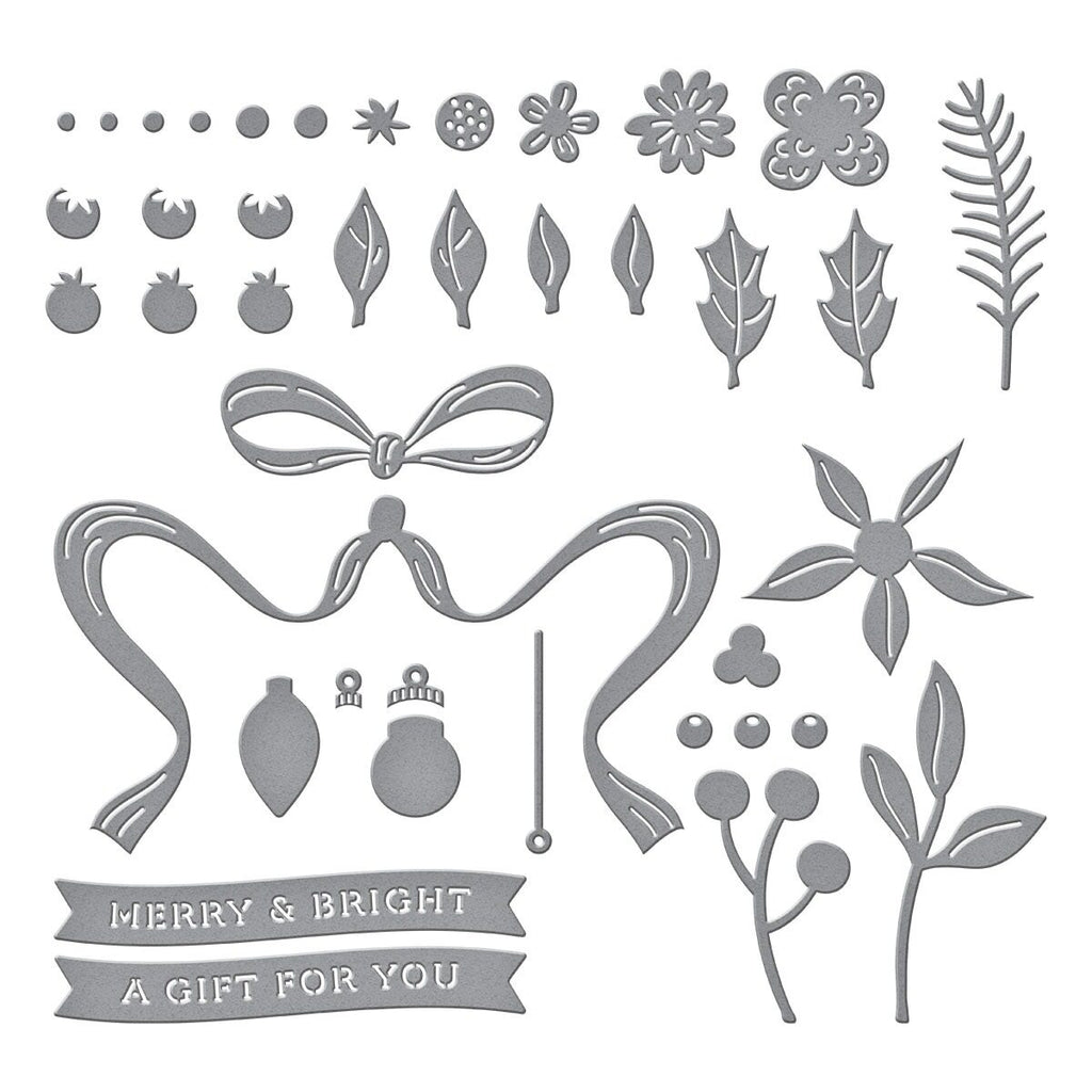 Gifting Bow Etched Dies are part of the Merry Moments Collection. This set of 24 thin metal cutting dies come together to create a stunning ribbon bow with a spray of holiday florals and ornaments. This versatile set is beautiful together as a ribboned bouquet, but the individual elements can also be used for their own projects! The bow makes a perfect topper for holiday cards and gift tags, and the flowers are perfect for adding a touch of color and whimsy anywhere! Also included are two sentiment strips, "Merry and Bright" and "A Gift For You."