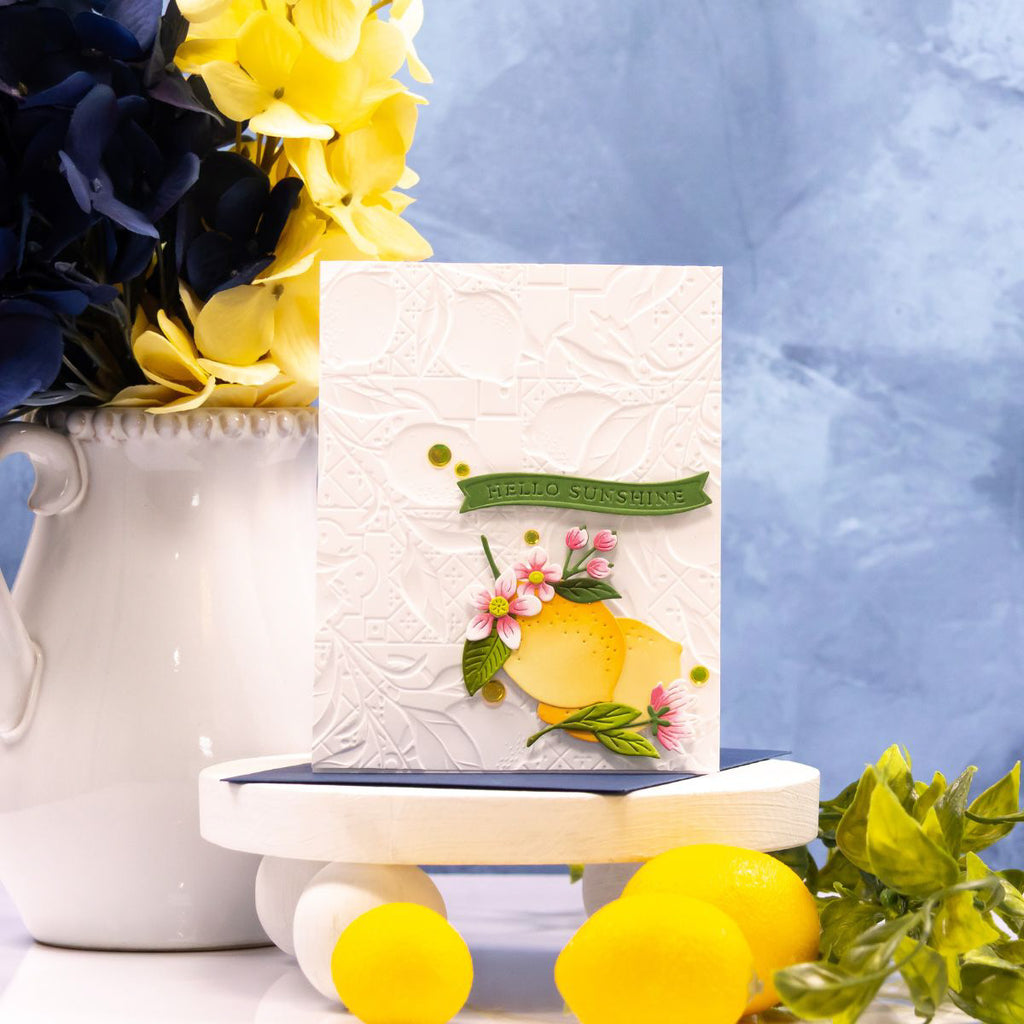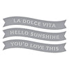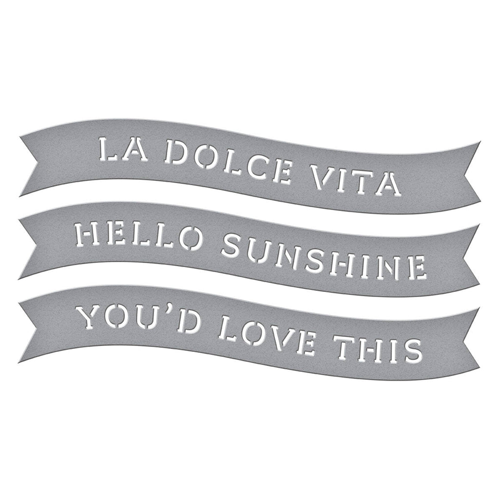 La Dolce Vita Banners Etched Dies are part of the La Dolce Vita Collection. This set of four thin metal cutting dies cut a total of three sentiment banners. Each sentiment is cut with an insert die and nested with a banner die; it makes slightly curved ribbon tail banner. The sentiments are: La Dolce Vita, Hello Sunshine, and You’d Love This.