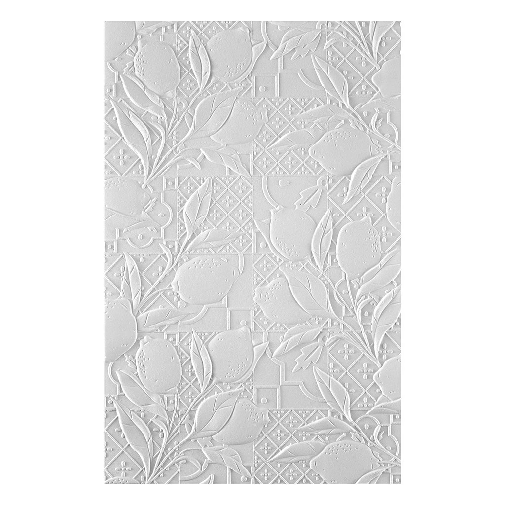 Lemon Fresco 3D Embossing Folder is a 5.50 x 8.50-inch embossing folder with a unique Mediterranean tile background and accent in a layer of stemmed lemons. Makes a fabulous addition in mixing and matching with other sets in this collection!