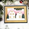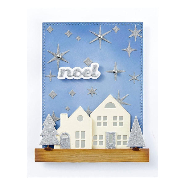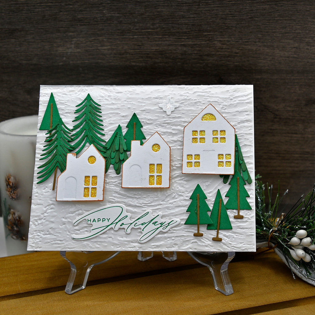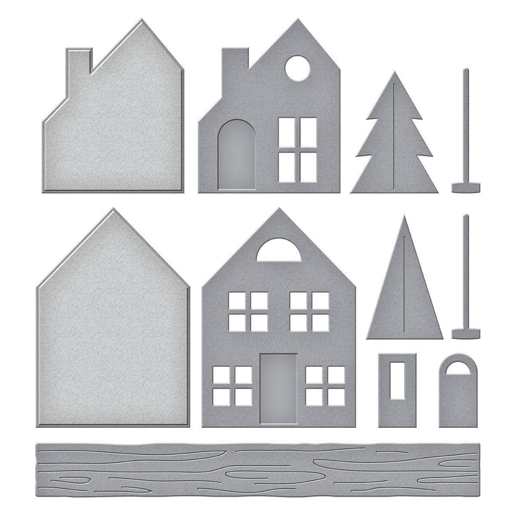 Mantel Village Etched Dies are from the Timeless Trees Collection by Simon Hurley. Create a sweet winter village on a wood mantel. The set of 10 thin metal cutting dies includes two house shapes, the matching insert dies with window and door details, two doors, two tree designs with their stands, and the wood mantel to complete the set. Works with S4-1398 Mantel Decorations to give the scene a festive look.