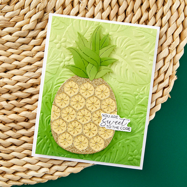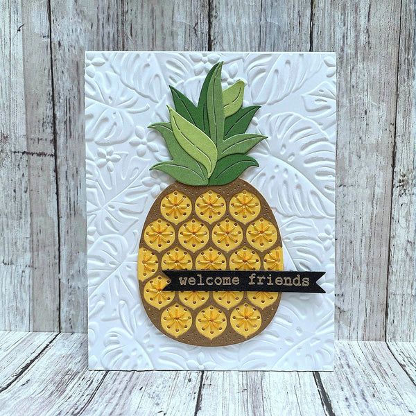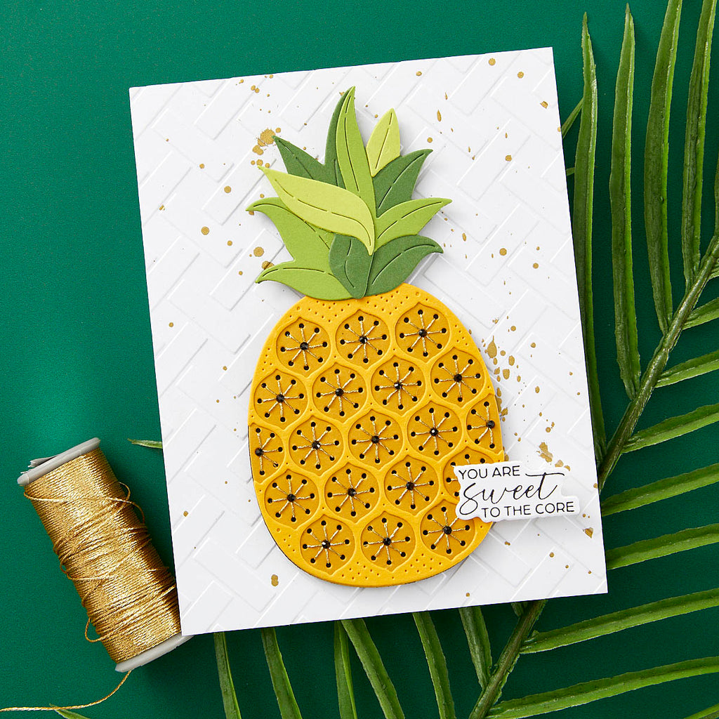 Stitched Pineapple - Stitching Die of the Month Die this 6-piece die set released May 2024 to our Stitching Die of the Month Club creates a fun and tropical stitched pineapple. Use to create cards, décor, gift card holder, gifts, and more! Add stitching to have even more textures in crafts.
