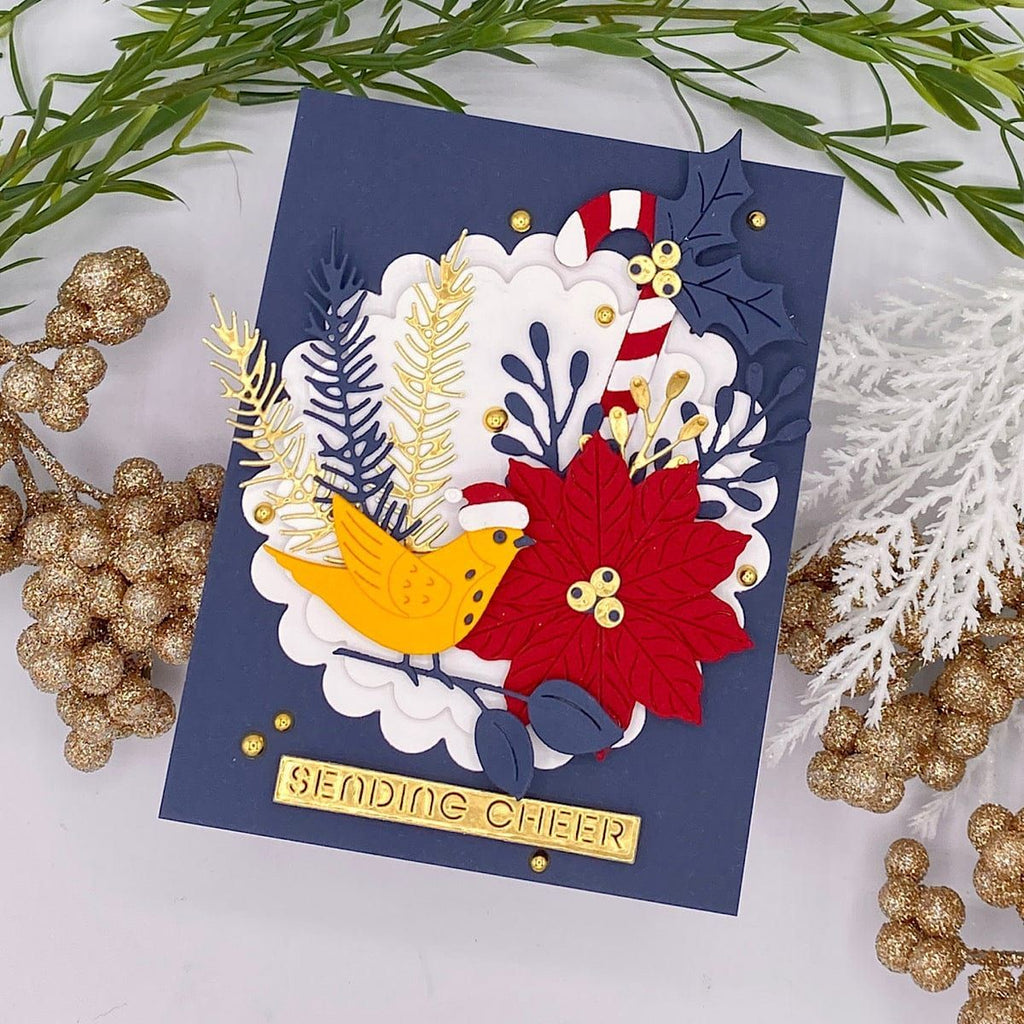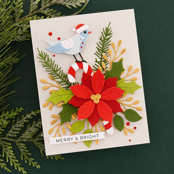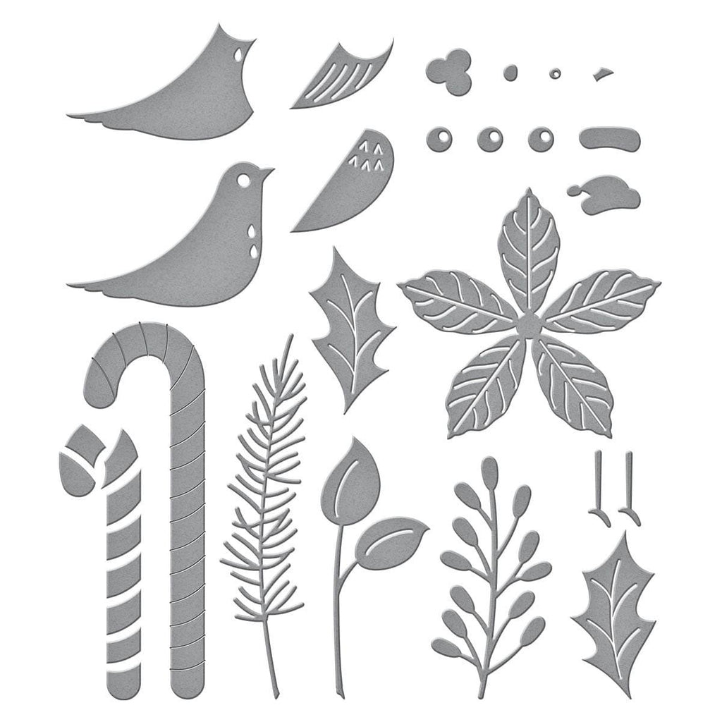 Christmas Bird Poinsettia Etched Dies are part of the Classic Christmas Collection by Spellbinders. This set of 13 thin metal cutting dies creates a sweet bird perched on top of a Poinsettia and candy cane bouquet. Use them together or separately, they create lovely holiday accents!