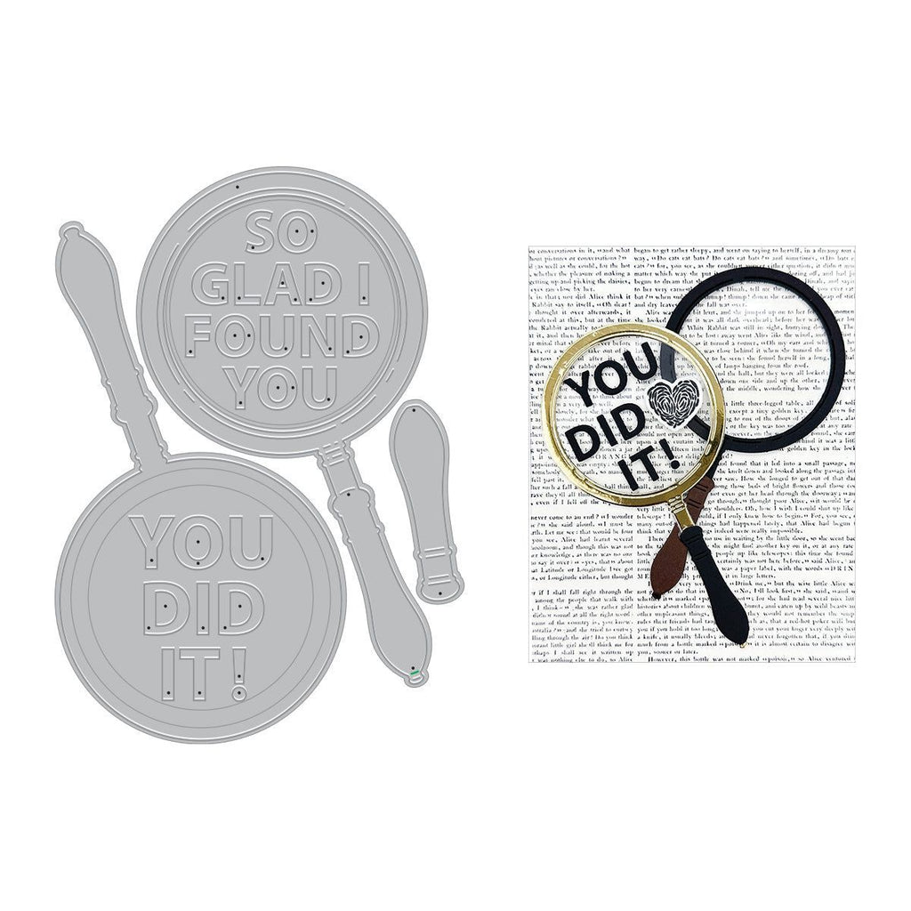 The Magnifying Glass Die Set from the Case Closed Collection is a set of five thin metal dies that come together to create a fun magnifying glass. Perfect for putting extra focus on your message, the set also includes two bold sentiments: 'You Did It!' and 'So Glad I Found You.' This die pairs well with CM801 It's No Mystery Stamp Set to add even more playful greetings.