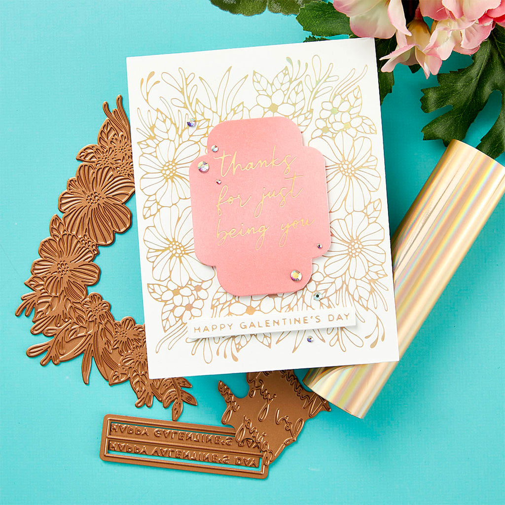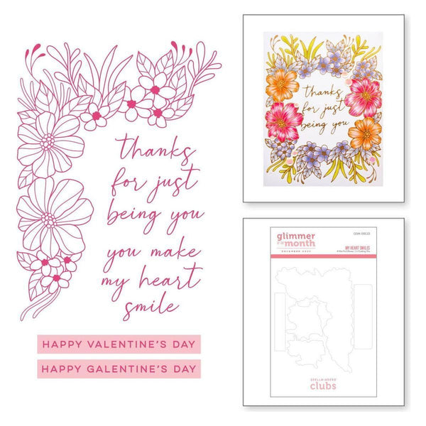 My Heart Smiles - Glimmer Hot Foil of the Month (Plates & Die Only). Released December 2023 to our Glimmer Hot Foil Kit of the Month Club, it is a wonderful addition to your glimmer collection. Perfect for adding sending sweet sentiments for any Valentine's Day. Glimmer Hot Foil Plates are designed to be used with the Spellbinders Glimmer Hot Foil System (or other compatible hot foil system). Depending on its design, some plates may be used for letterpress and embossing.