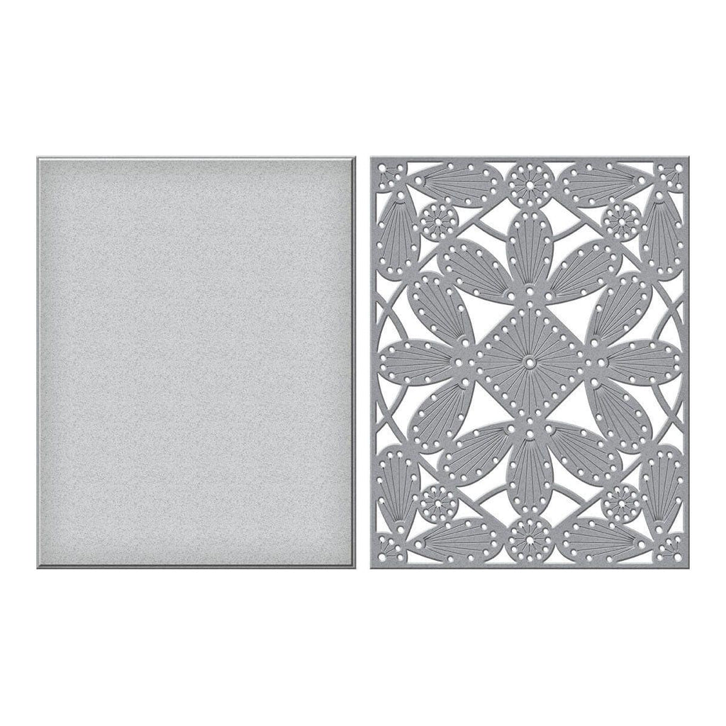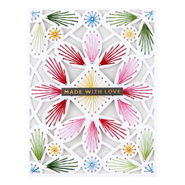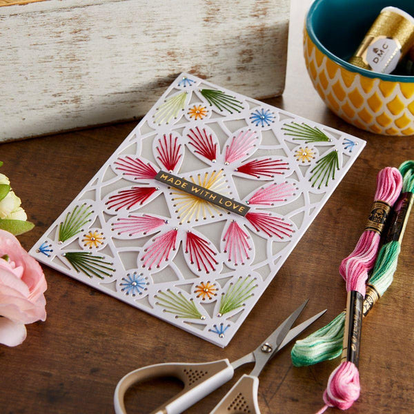 Stitched Petal Frame Etched Dies is from the Spring into Stitching Collection is a set of two thin metal dies. The Frame Insert cuts dots to act as a guide for stitching the patterns with embroidery floss and needle. Or use the designs as is because the embossed lines act as faux stitched details. Nest with the Frame Outline die, for a beautiful intricate A2-size (4.25 x 5.5-inch) panel. Designer’s Tip: using two strands of six strand DMC Floss or DMC Diamant Metallic Thread and Size 22 Tapestry Needle (sold separately) are recommended.