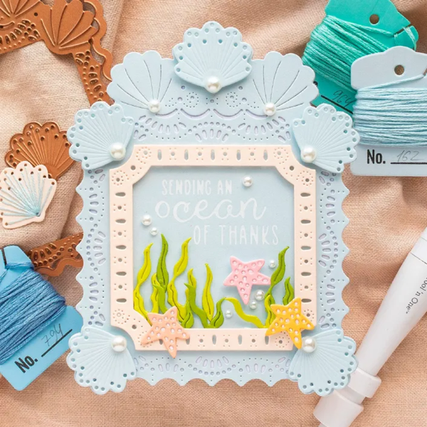 Stitched Shell Card Front - Stitching Die of the Month Die Set, cuts, embosses, debosses. Released June 2023 to our Stitching Die of the Month Club creates a fun clam shell background and frame. Use to create cards, décor, gift card holder, gifts, and more! Add stitching to have even more textures in crafts.