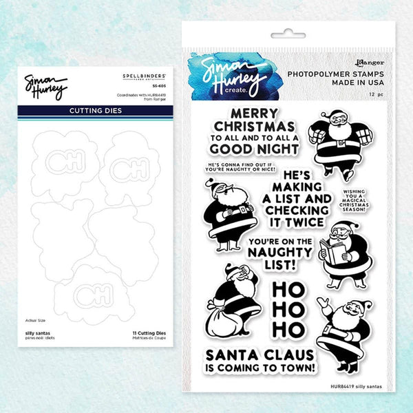 Silly Santas Stamp and Die Bundle by Simon Hurley includes HUR84419 Ranger Silly Santas Clear Stamp Set and Silly Santas Etched Dies. Together, they create a set of fun, stylized Santas in a variety of poses. These cute characters are a perfect focal point for a card, but can also make an adorable pattern for any project. Use together to create to create a playful, dimensional card ideal for holiday gift-giving.