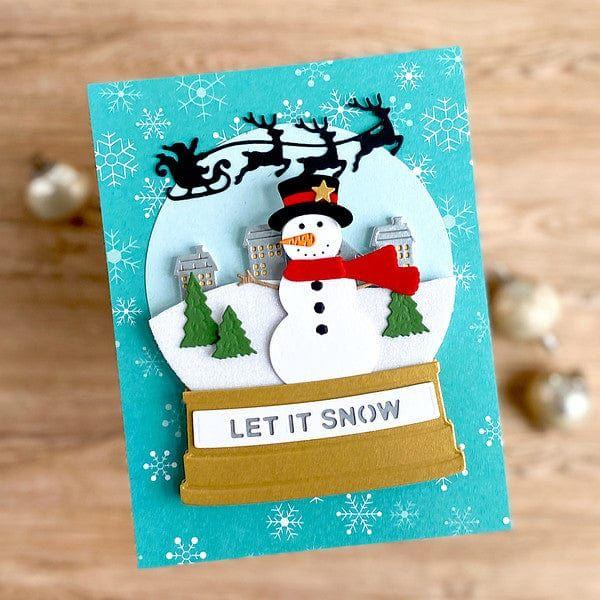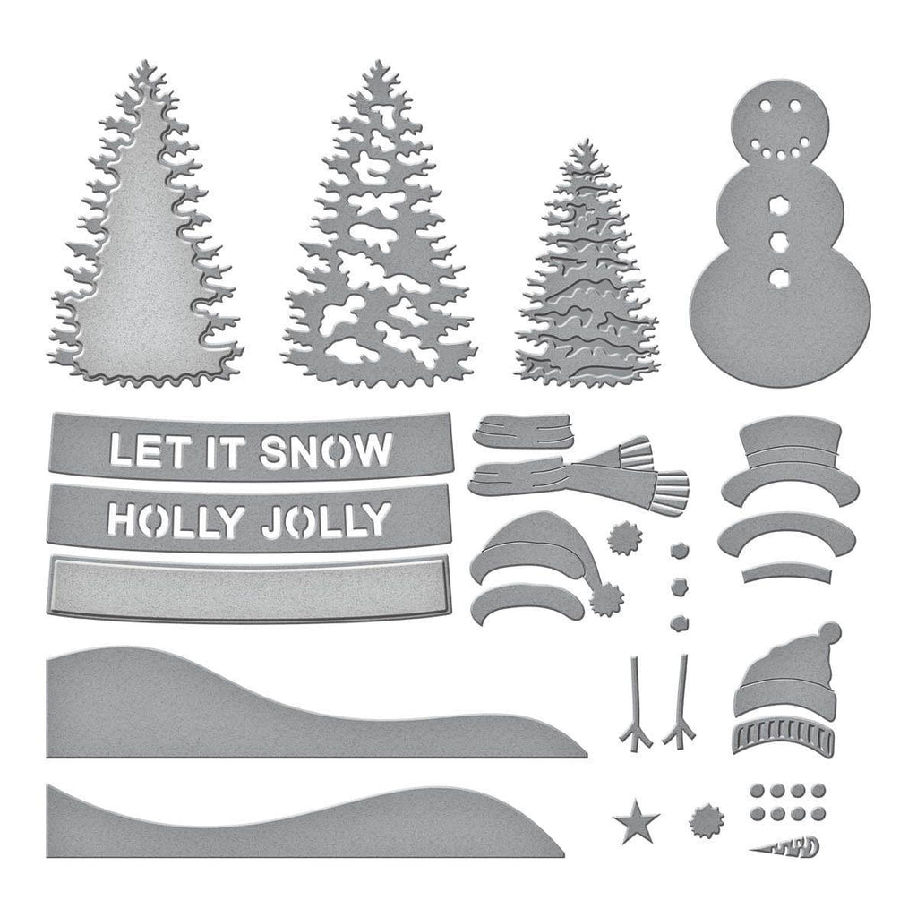 Snowman Scene Etched Dies are from the Simon's Snow Globes Collection by Simon Hurley. Designed to work with S6-222 Simon's Snow Globe Etched Dies, this set of 17 thin metal cutting dies adds a magical snow scene to the ensemble. It includes snowman and his accessories, evergreen trees, soft slopes and more. There are two sentiments in the set, Let it Snow and Holly Jolly. Mix and match with other scene sets in the collection!