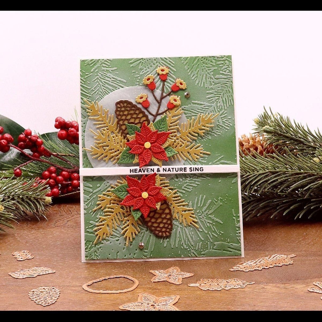 Forevergreen Embossing Folder is part of the Tis the Season Collection and embosses a background of pine needle branches. Designed to fit an A2-sized (4.25 x 5.5-inch) card base. Apply ink on one side of folder and add cardstock for a letter press effect. Or highlight the raised embossing with ink for a different look. A perfect background to any of the holiday or winter sets.