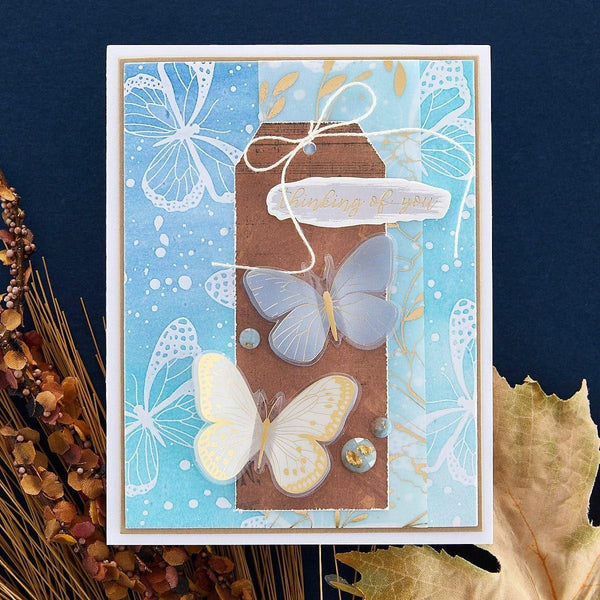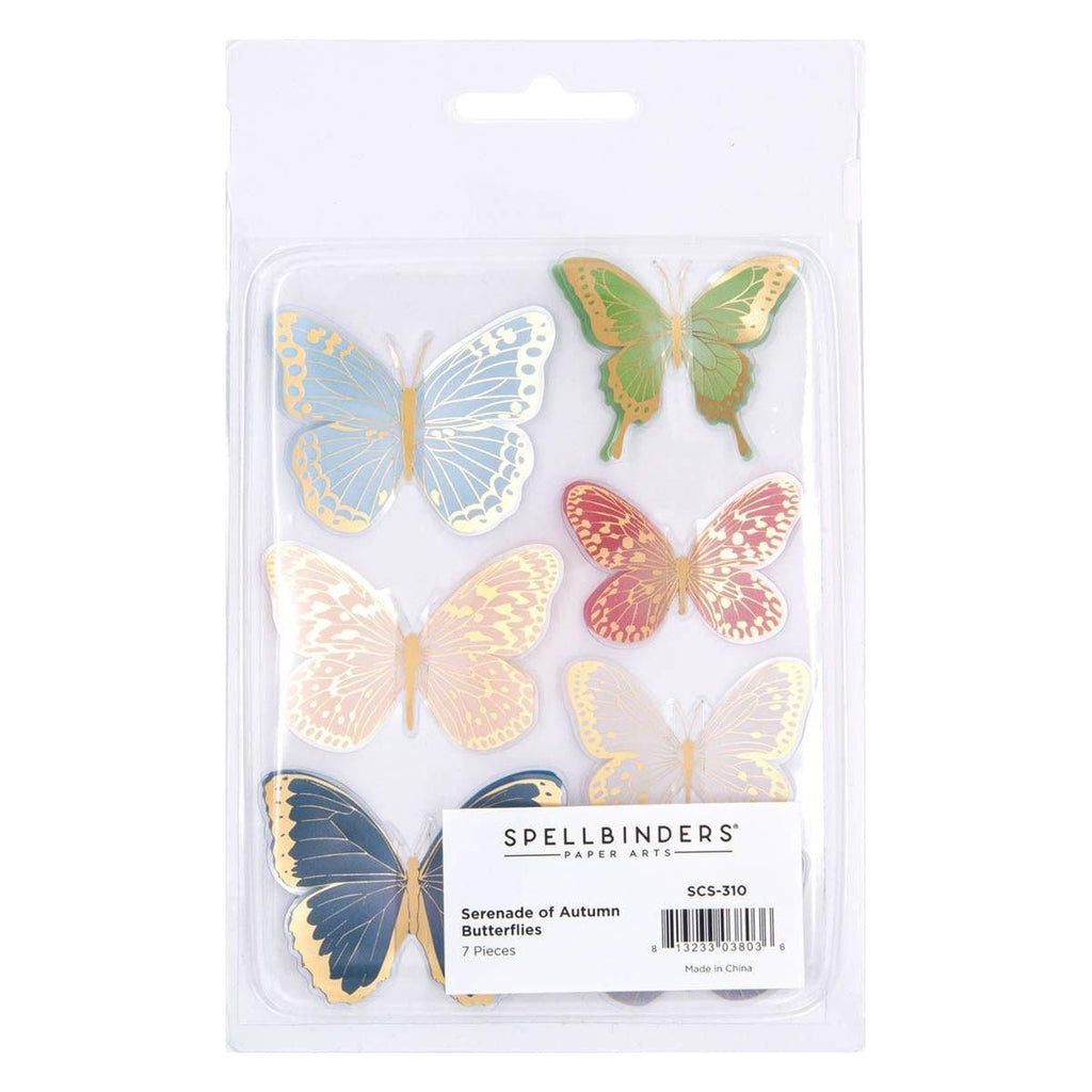 Dimensional Autumn Butterfly Stickers is a part of the Serenade of Autumn Collection. You'll fall in love with this set of seven adorable butterflies. They add dimension and movement to any project, and with the foil accents on the wings, even extra sparkle! Made of printed acetate, each butterfly has a flat adhesive layer and a dimensional top layer that makes the wings flutter. In soft fall pastels accented with gold foil, they almost seem to fly off the page!