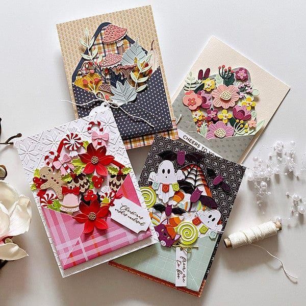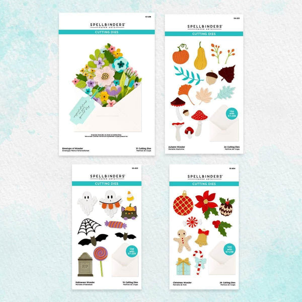 Envelope of Wonder Dies Bundle includes all of the dies in the Envelope of Wonder Collection. With this bundle, you'll have everything you need to make adorable blooming envelopes for every season. This bundle includes four die sets, S5-603 Halloween Wonder Etched Dies, S5-604 Christmas Wonder Etched Dies, S6-220 Autumn Wonder Etched Dies, and S7-238 Envelope of Wonder Etched Dies.