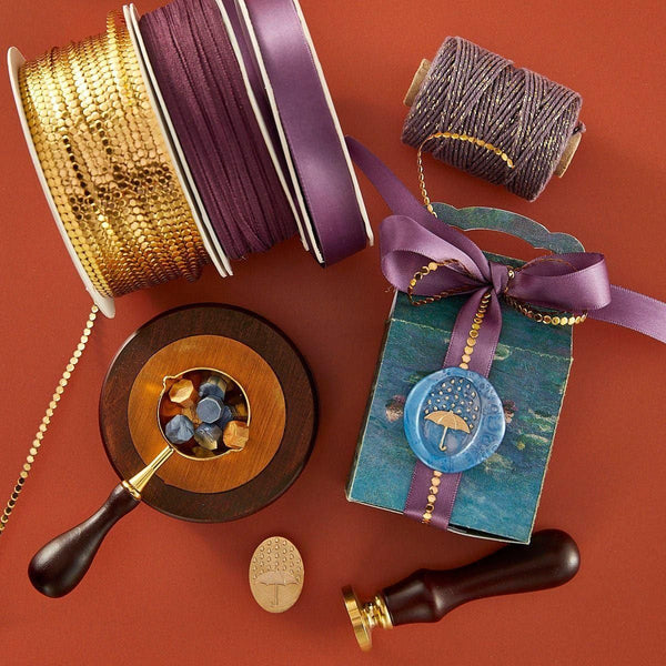 Falling Raindrops Wax Seal Stamp is part of the Falling Leaves Collection. It has one wooden handle that supports a larger size of 1.00 x 1.25 in. oval brass stamp design on its end. It stamps an open umbrella on a rainy day. What a fun and playful accent on any project!