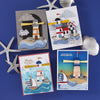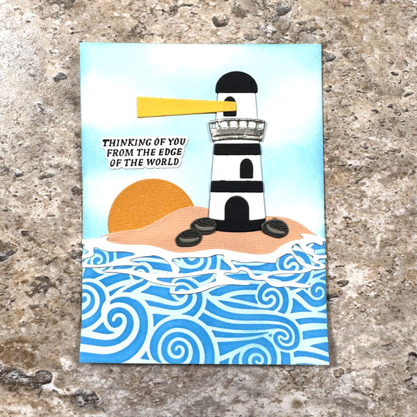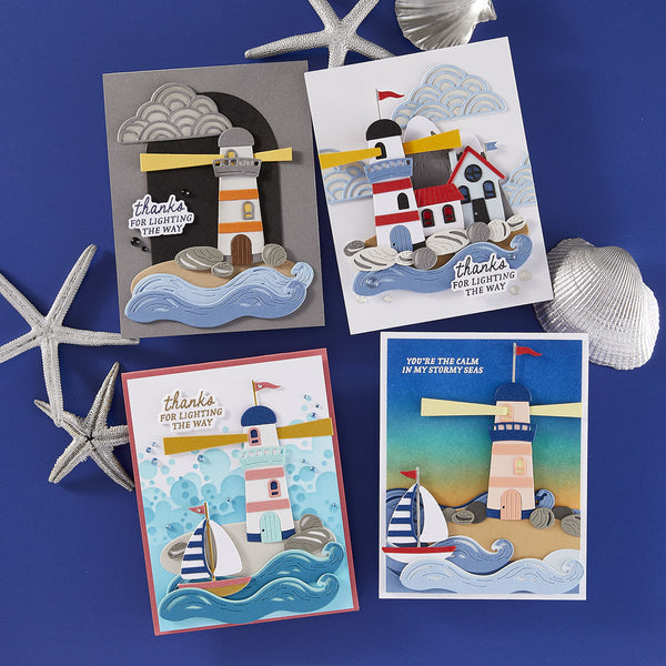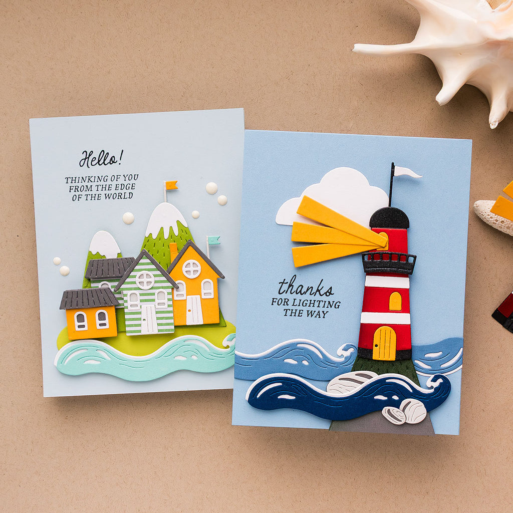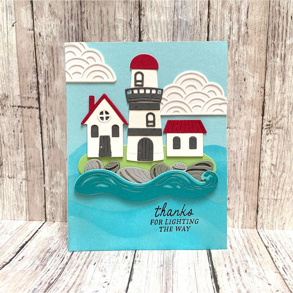 Create a full maritime landscape with mix-and-match elements like light beams, a flag-topped tower, and pebbled textures. Whether you're crafting a thank-you card, masculine birthday, or nautical home décor, this set brings serene seaside vibes to every project.