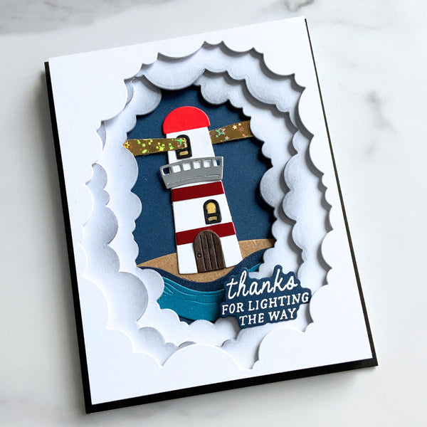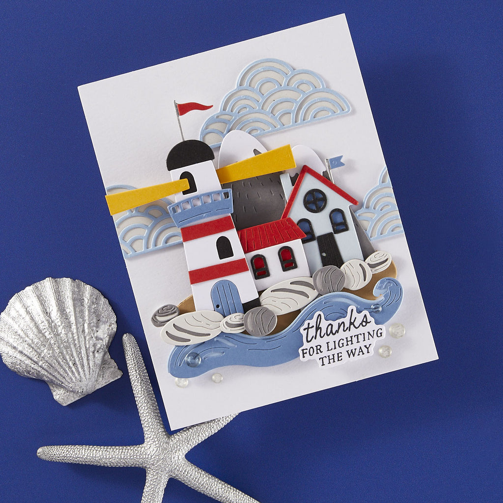 Shine a light on seaside scenes with the Sailor’s Day Large Die of the Month! This 31-piece detailed layering set builds a charming lighthouse with cozy coastal cottages, swirling waves, rocky shores, and puffy clouds—perfect for storytelling and dimensional cardmaking.