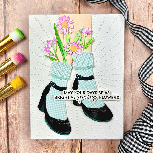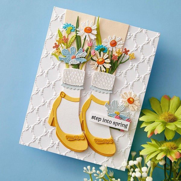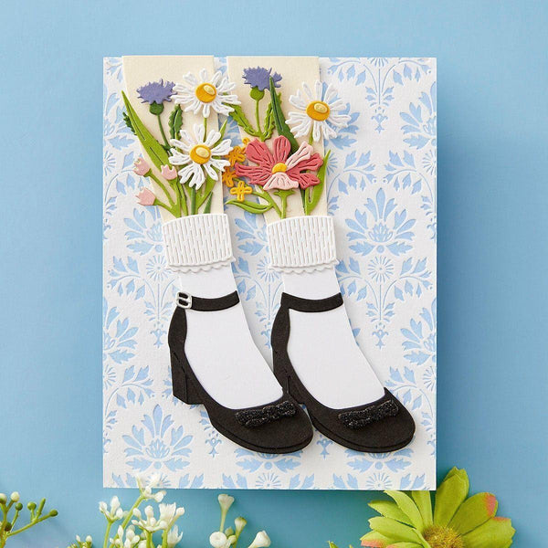 Step Into Spring - February 2025 Small Die of the Month: Step into a world of charm and nostalgia with this delightful 17-piece die set. Featuring a beautifully detailed pair of vintage-inspired shoes, scalloped socks, and a selection of delicate spring florals, this set captures the essence of springtime elegance. Perfect for crafting whimsical cards, enchanting scrapbook layouts, and seasonal décor, it brings a touch of timeless beauty to your projects. Let your creativity bloom and make every creation a step toward spring magic!
