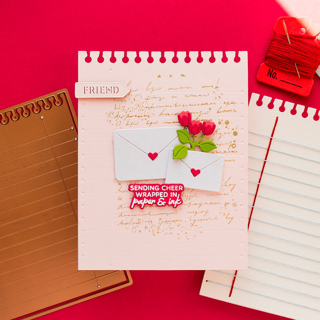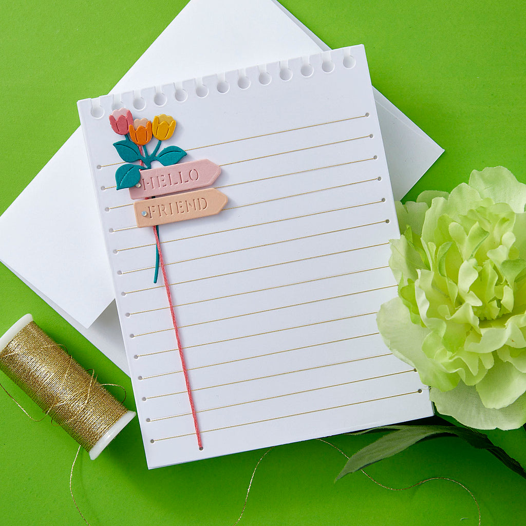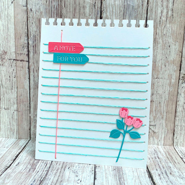 Stitched Taking Notes – April 2025 Stitching Die of the Month Add a charming hand-stitched flair to your paper projects with the April 2025 Stitching Die of the Month: Stitched Taking Notes. This clever 9-piece die set is designed to mimic a spiral-bound sheet of notebook paper, complete with stitching guide lines and notched edges for an authentic, whimsical touch.