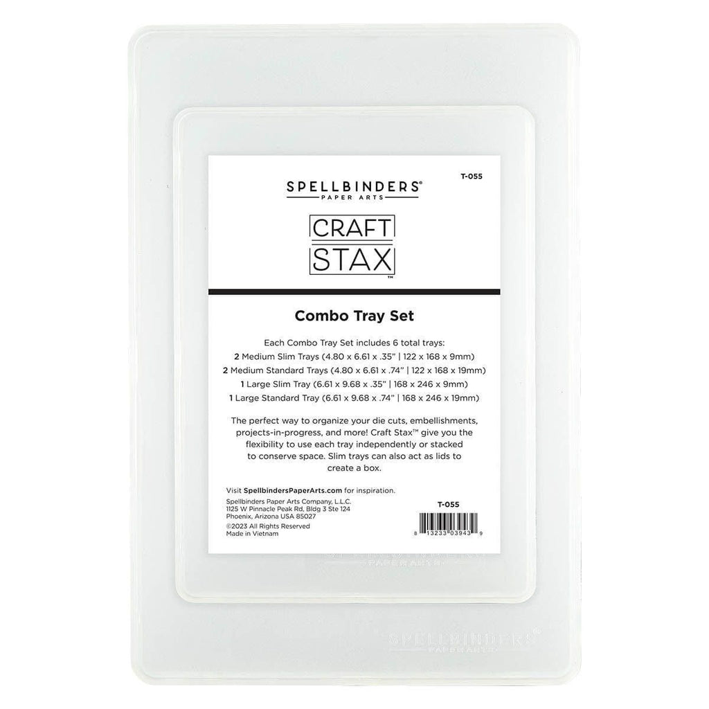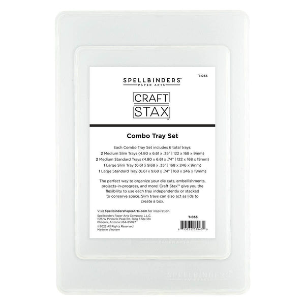 Craft Stax - Combo Tray Set This combo set includes six stackable frosted plastic trays that combine to create three storage boxes - one large and two medium. These versatile trays can be used in multiple ways: combine a slim tray with a standard tray to create a storage box, use each tray separately, or stack them all together for a space-saving storage solution.