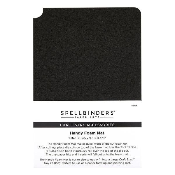 Handy Foam Mat is a 6.375 x 9.5 x 0.375 in./16.19 x 24.13 x 0.95 cm mat makes quick work of die-cut clean up. After die-cutting, place the die-cut shape on top of the foam mat. With the T-035 Tool ‘N One’s brush tip, vigorously roll over the top of the cut shape to loosen tiny paper bits and inserts for them to fall out onto the foam mat. The Handy Foam Mat is cut to easily fit a T-057 Large Craft Stax™ Tray. Also, perfect to use as a paper forming and piercing mat.