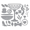 A Special Toast Etched Dies are from the Happier Hour Collection. When assembled, this set of 22 thin metal cutting dies creates many kinds of elegant drinks in a detailed cut coupe glass. The liquid in the glass even has a bubbles pattern with the insert die. For extra fun, there are accents to set the mood: flowers, bowtie, high heels, ribbon and more! Full of playful celebratory sentiments, this set works well with BP-338 A Special Toast Sentiments BetterPress Plates to add the perfect finishing sentiments.
