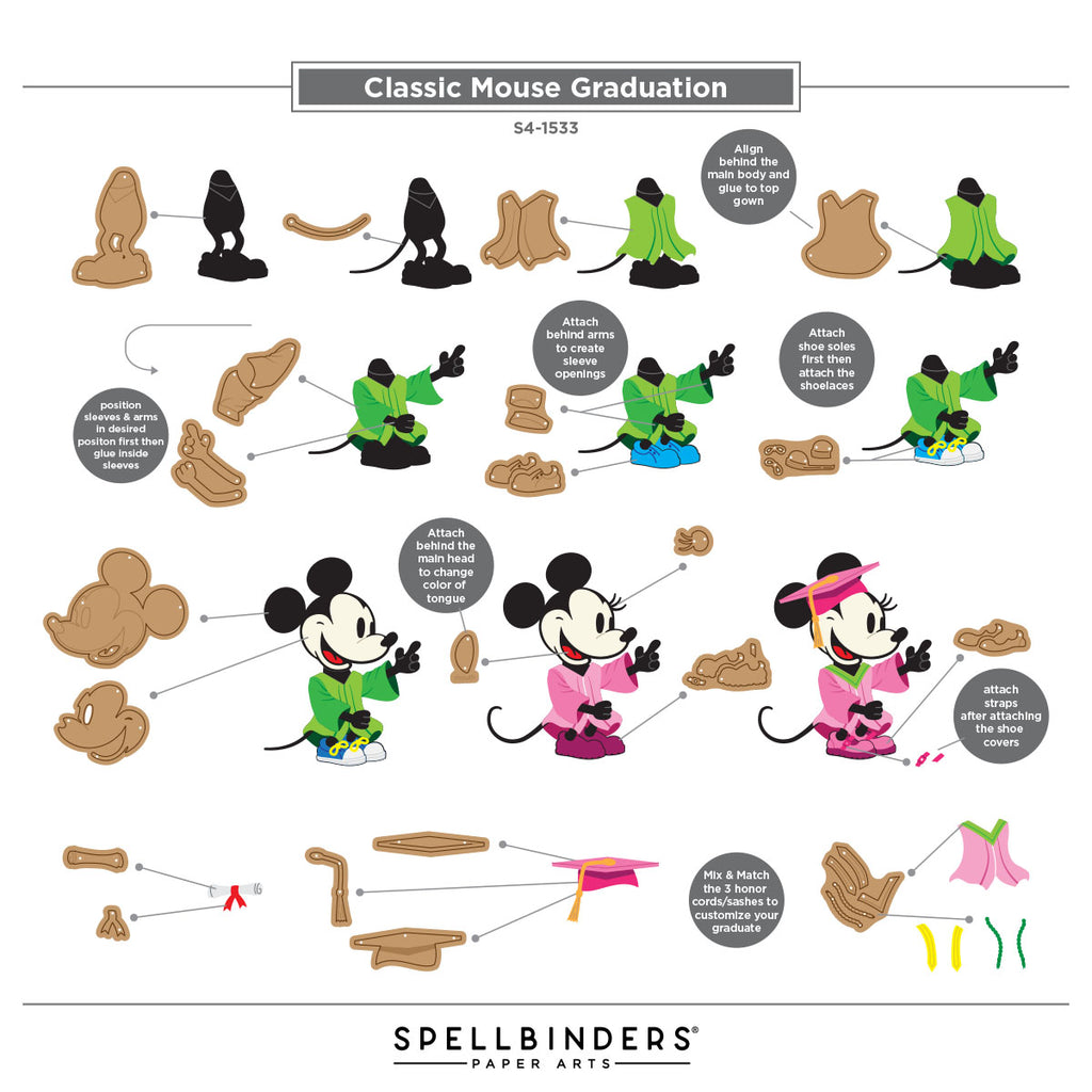 Classic Mouse Graduation Etched Dies are part of the Classic Mouse Graduation Collection. When assembled, the set of 22 thin metal cutting dies creates our favorite mouse couple gearing up for graduation with their cap and gown outfits! It also includes details like a rolled-up diploma tied up with a bow and sneakers. Add your school colors to personalize them.