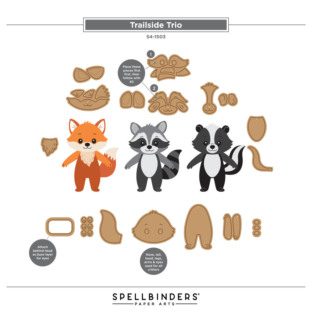Trailside Trio Etched Dies are from the Summer Camp Collection by Allison Frazier. This set of 17 thin metal cutting dies creates three sweet forest friends of a fox, raccoon and skunk. Pair them with S4-1504 Splash Days and S5-740 Camp Days sets, for a camping adventure of all kinds from fishing to campfire fun! If you want more cute critter friends, consider the S5-738 Woodland Trio set!