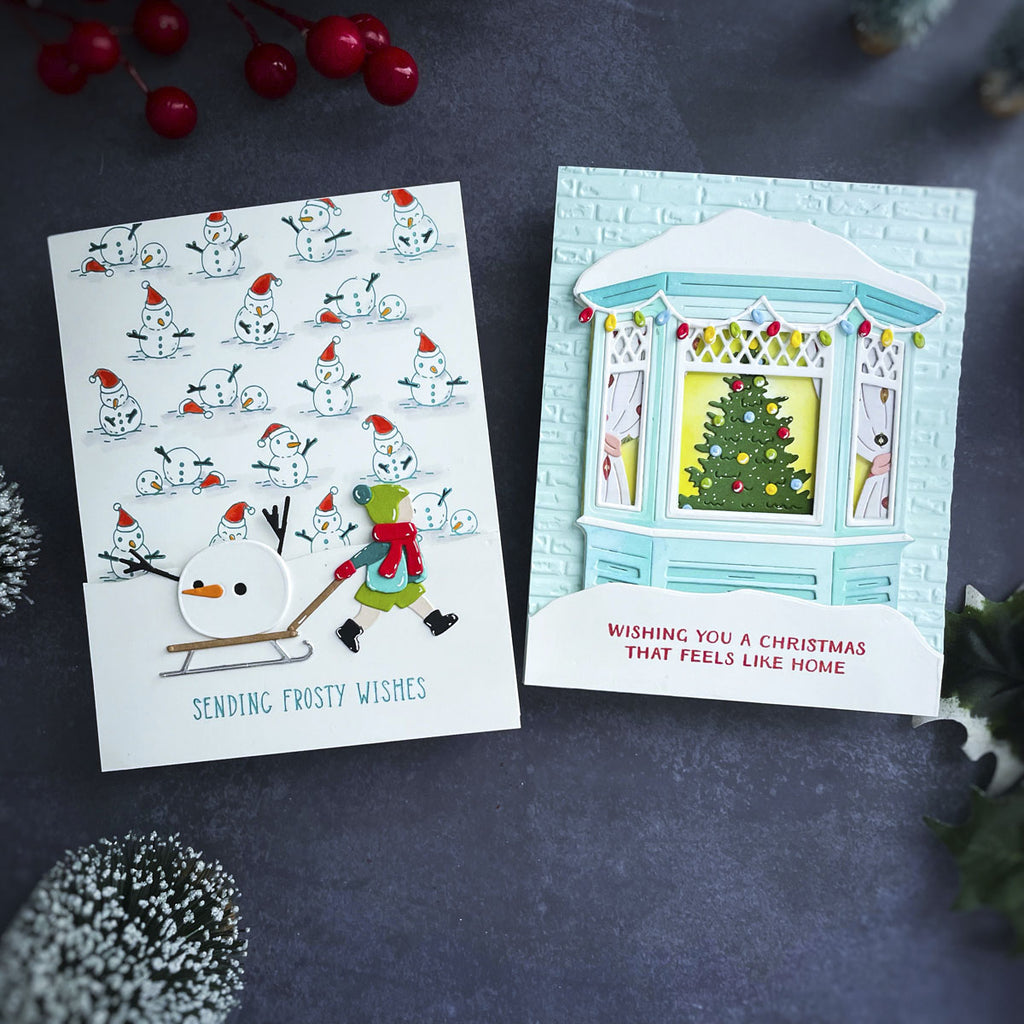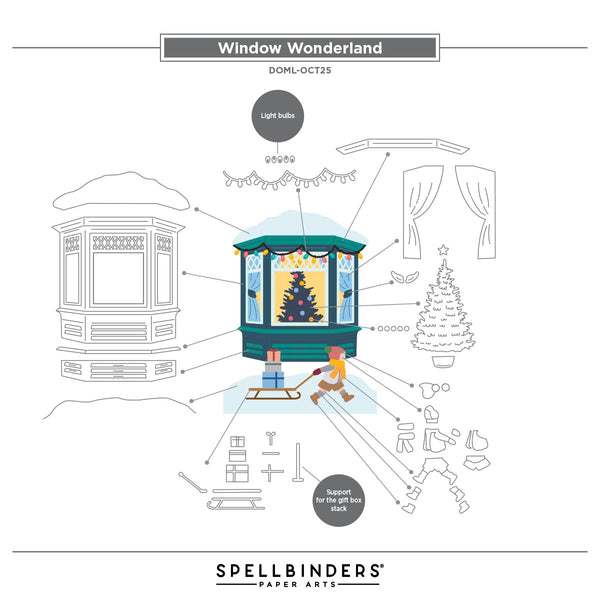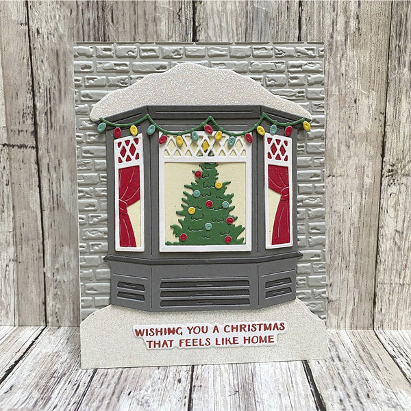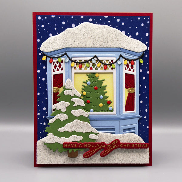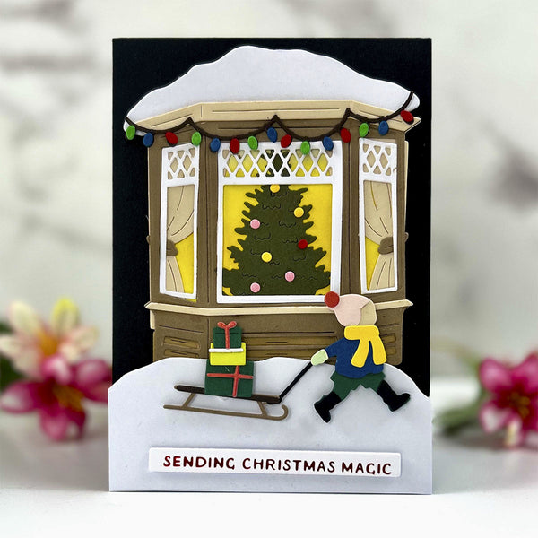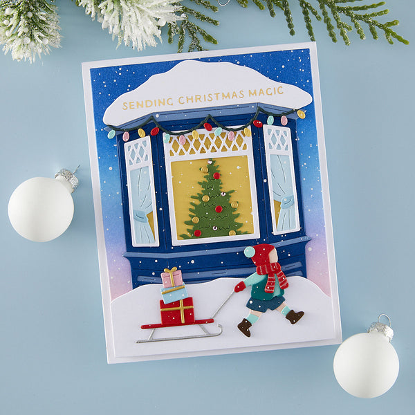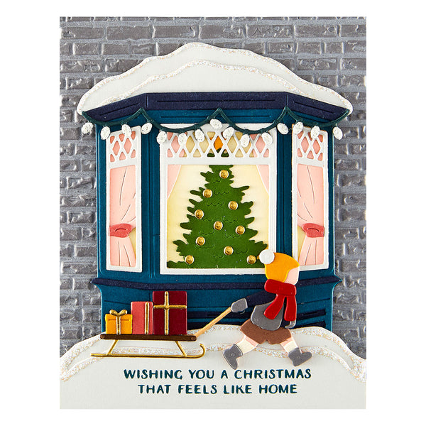Create a heartwarming holiday scene with the Window Wonderland Large Die of the Month. This detailed set builds a charming bay window view, complete with snow-covered trim, twinkling lights, a glowing Christmas tree, and a bundled-up child pulling gifts on a sled.