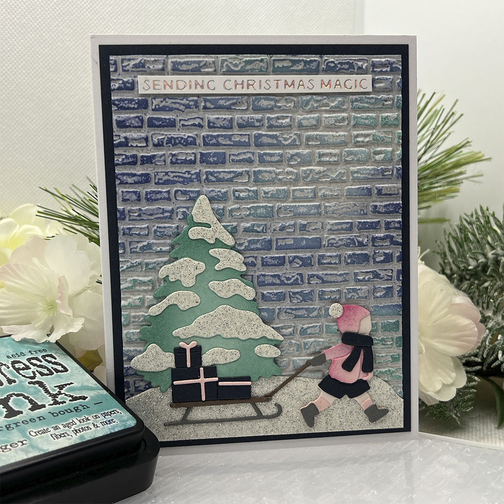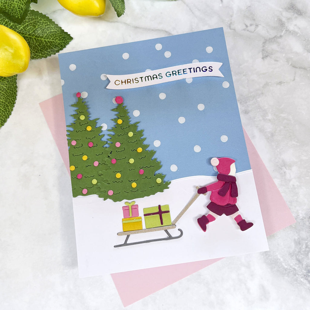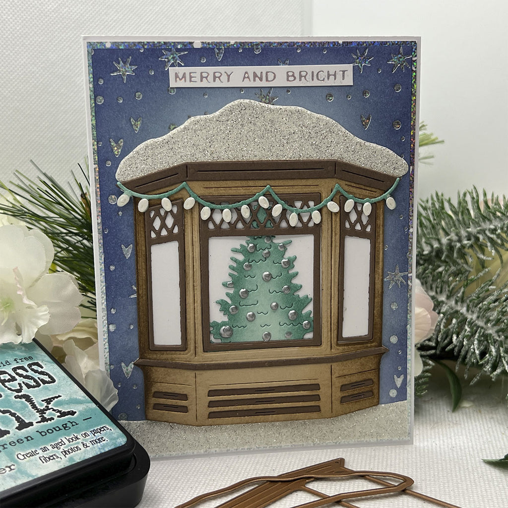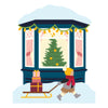 Create a heartwarming holiday scene with the Window Wonderland Large Die of the Month. This detailed set builds a charming bay window view, complete with snow-covered trim, twinkling lights, a glowing Christmas tree, and a bundled-up child pulling gifts on a sled.