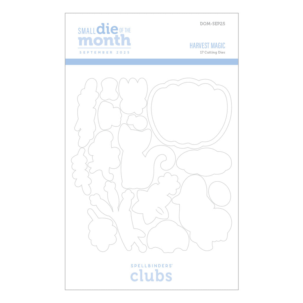 Celebrate the whimsy of the season with the Harvest Magic Small Die of the Month. This 17-piece set features a cheerful pumpkin centerpiece surrounded by a playful mix of Halloween and fall elements—a black cat, friendly ghost, skull, florals, and foliage—all ready to bring your autumn cards to life.