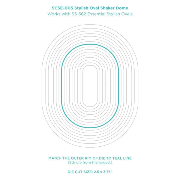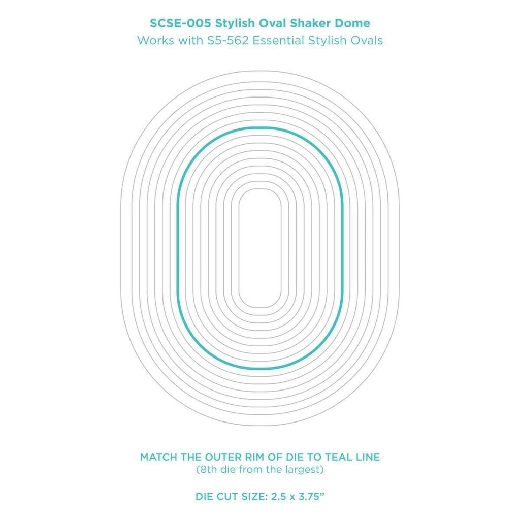 Stylish Oval Shaker Dome comes in a pack of six clear shaker domes. The raised area measures 0.38 inches so you can fill it with chunky glitter, shaker mixes and more for a wonderful interactive project! Add to your card, scrapbook layout, home décor and beyond. Works well with S5-562 Essential Stylish Ovals Etched Dies to die-cut patterned paper, stamped images or even a photo to add to the inside.