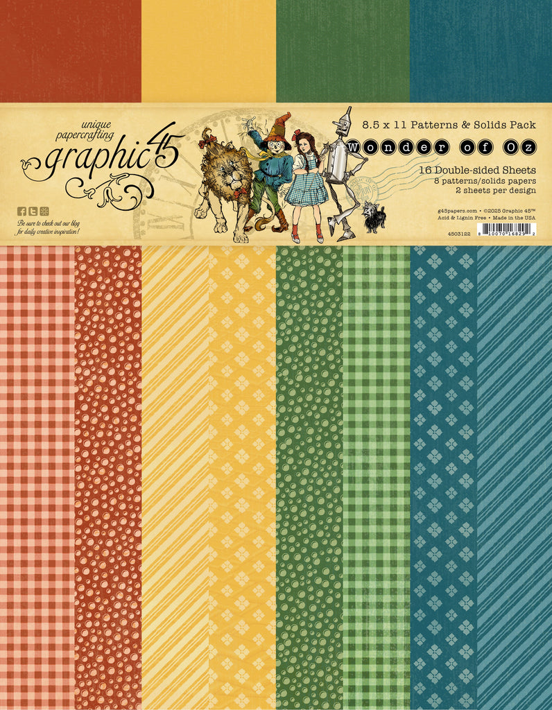 The path to the Emerald City is bright and colorful with this Graphic 45 Wonder of Oz 8.5” x 11” Patterns & Solids Paper Pack, a set of 16 sheets of double sided solid and patterned papers is classic hues of red, yellow, green and blue. Featuring versatile and easy to use patterns, these papers coordinate with the other items in the Wonder of Oz collection for effortless projects that look stunning. Perfect for scrapbooks, party invitations, decorative tags, handmade cards and more.