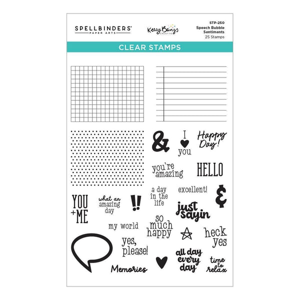 Speech Bubbles Sentiments Clear Stamp Set is from the Just Sayin’ Collection by Kelly Bangs. Express yourself with this set of 25 clear stamp images! It has 15 different sentiments, two accents, three punctuations, three background designs, and a circle speech bubble. Designed to work with S5-664 Speech Bubbles Etched Dies to create even more expressions.