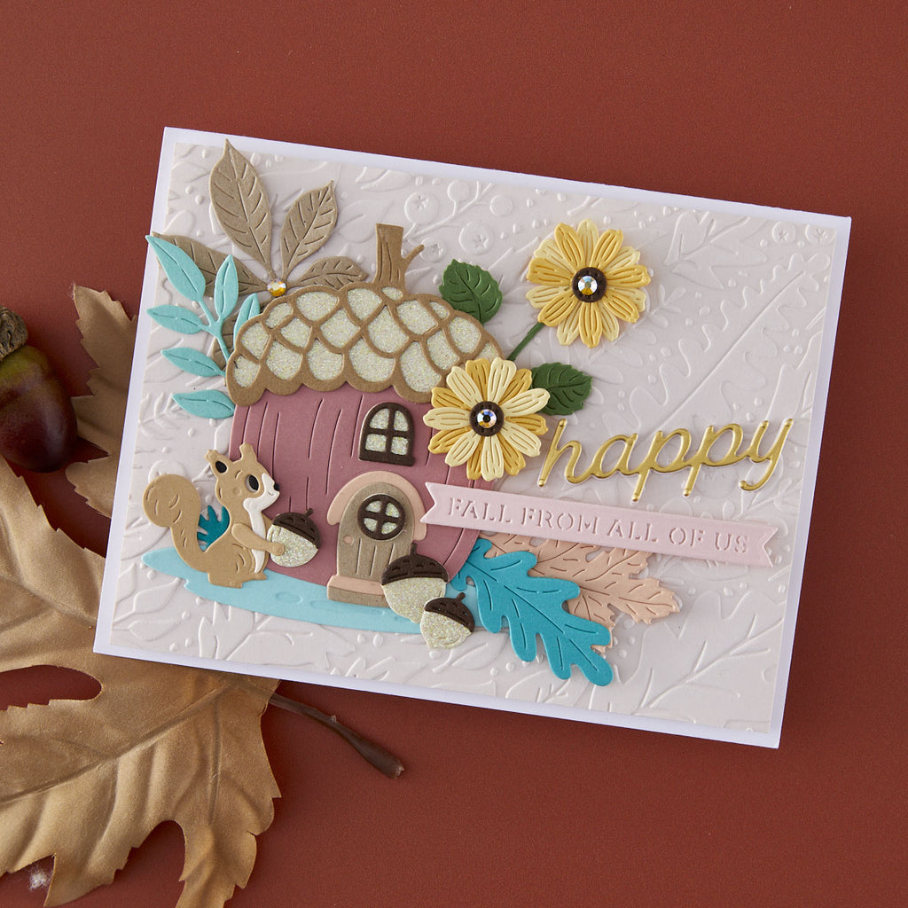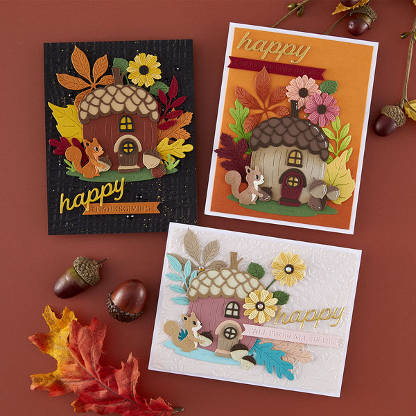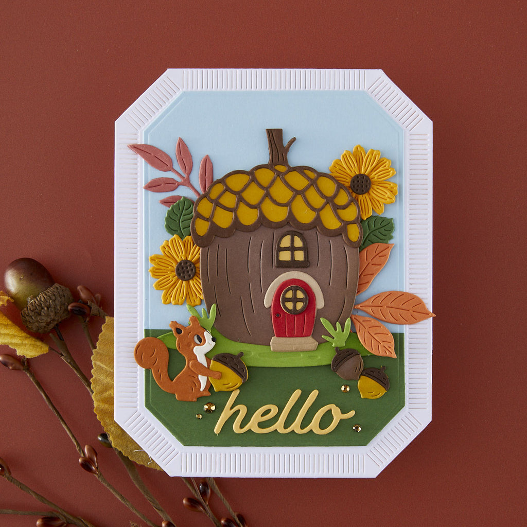 Welcome to Acorn Acres, where autumn’s magic comes to life! This 26-piece die set builds an adorable acorn-shaped cottage surrounded by layered leaves, cheerful flowers, and a sweet little squirrel. Every detail—from the textured roof to the tiny door—adds storybook charm to your fall cards and seasonal décor.