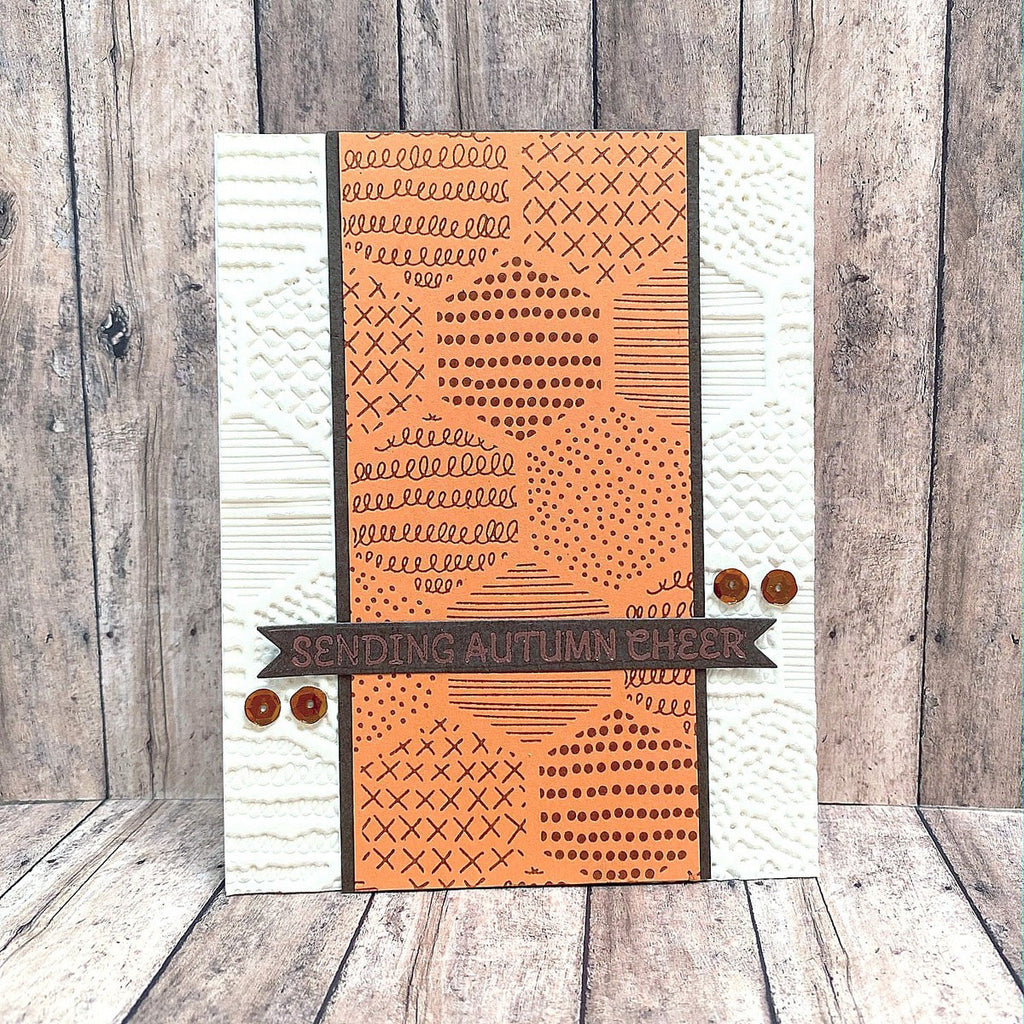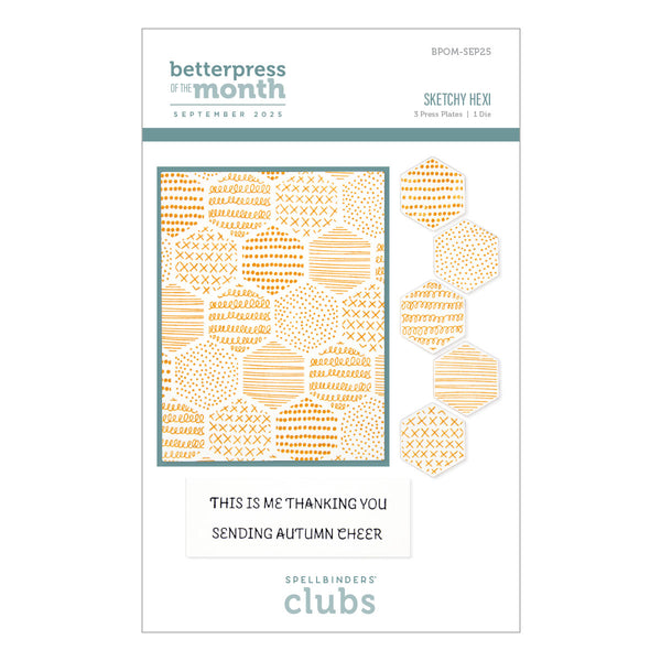 Add modern, homespun charm to your cards with the Sketchy Hexi BetterPress Plate Set. This playful design layers hand-drawn hexagons filled with whimsical stitched and doodled patterns, perfect for adding cozy detail to any seasonal or everyday project. Two coordinating sentiments—“Sending Autumn Cheer” and “This Is Me Thanking You”—complete the set with warmth and versatility.