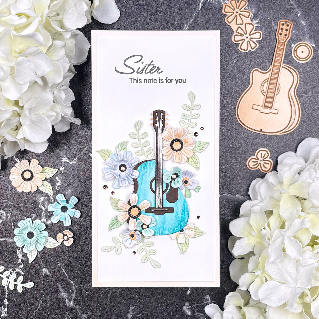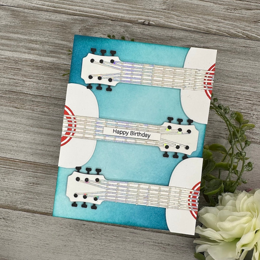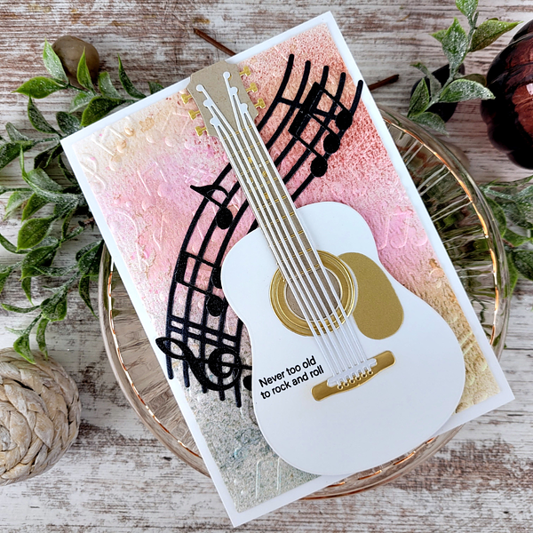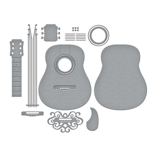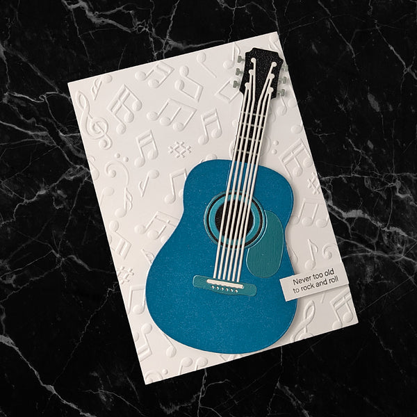 Majestic Guitar Etched Dies are part of the Bibi's Musical Notes Collection by Bibi Cameron. When assembled, this set of 11 thin metal cutting dies makes a magnificent guitar that measures approximately 3.45 x 7.00 in./8.70 x 17.80 cm. Big enough to fit an A7-size card front or larger! Make it unique guitar-shaped box by grabbing the BD-0978 Majestic Guitar Box Creator Bundle that includes a side panel die to make it three dimensional.