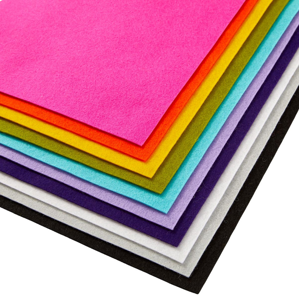 Merino Wool Felt Sheets - Kaleidoscope Collection is 100% Merino Wool felt material and comes in a pack of 10 assorted colors. The colors include one each of Candy, Bonfire, Honey, Spring, Potion, Pansy, Magic, Snow, Sterling, Coal.