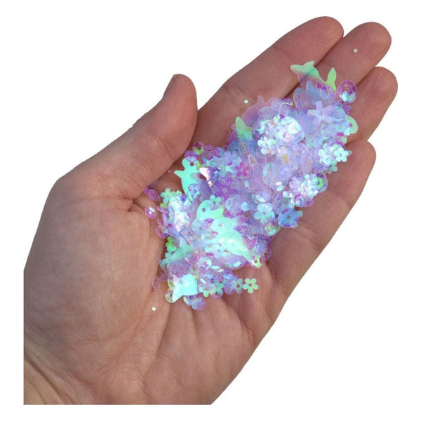 Clearly Easter Sequinz is a craft embellishment mix from Buttons Galore and More. Buttons Galore's craft sequins are made from the highest quality PET and PVC material for a superior look. This set of sequins includes hopping bunnies, different sizes of flower sequins, as well as iridescent circles, perfect for shaker crafts and adding sparkle to all kinds of craft projects. They are great for use on scrapbook pages, papercrafts, kids crafts, creative memories, clothing, cell phones, nail art and many other arts and craft creations. With a generous 15 grams in each pack, you will have plenty of sequins for your diy projects.