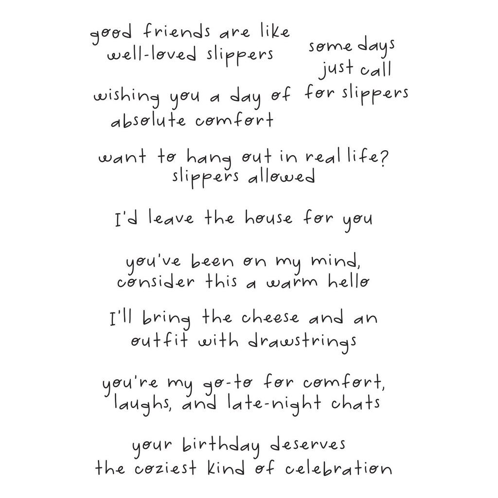 Design sweet, layered characters, then finish your cards with sentiments that say it all — from “you’re my go-to for comfort” to “your birthday deserves the coziest kind of celebration.” Perfect for anyone who believes the best days start (and end) in slippers.