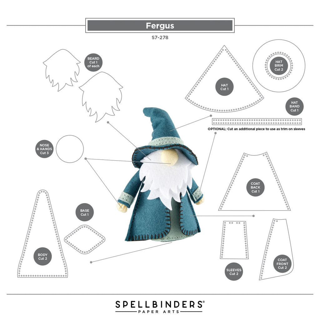 Fergus Etched Dies are part of the 3D Felt Décor Collection by Sandi MacIver. When assembled, this set of 11 thin metal cutting dies makes a wonderful dimensional Gnome! Detailed stitching design on the edges gives a wonderful, finished look and creates a guide for stitching the gnome together. Cut with our Merino Wool Felt Sheets sets to bring it to life in texture and dimension or cut in paper for an entirely different look. For more interest, add sweet tiny buttons from our embellishment section! The finished Fergus measures approximately 3.75 x 6.25 x 1.75 in./9.50 x 15.90 x 4.50 cm.