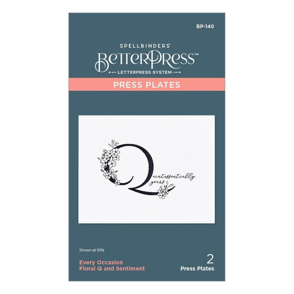 Floral Q and Sentiment Press Plate is part of the Every Occasion Floral Alphabet Collection and includes two press plates. The largest plate is a stunning contemporary uppercase Q font accented with floral details. The second plate compliments the letter with a sentiment, (Q)uintessentially yours. Ink the plates with the BetterPress Ink to be pressed against the BetterPress Cotton Card Panel and Sheets for a crisp letterpress design.