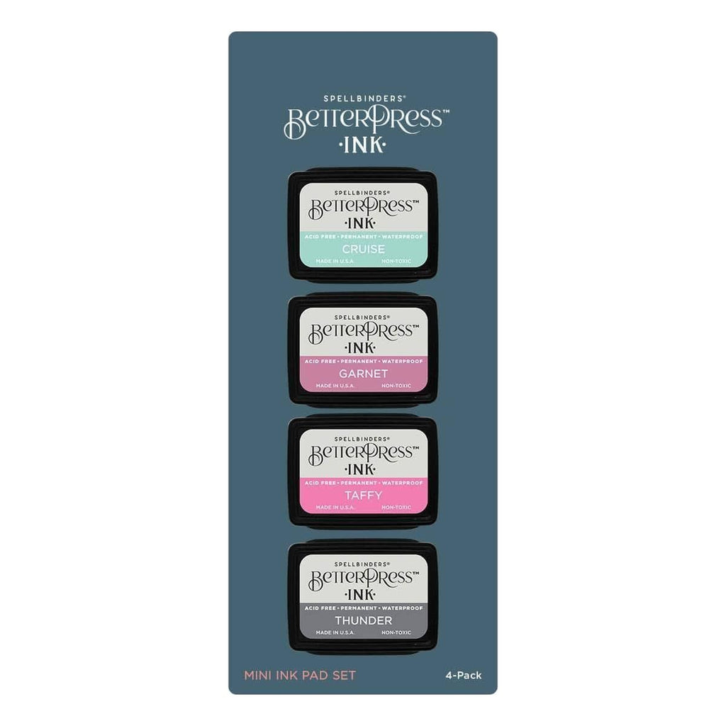 Jet Set BetterPress Ink Mini Set includes four 1.25 x 1.75-inch ink pads in colors of Garnet, Taffy, Cruise, and Thunder for rich, vibrant hues reminiscent of summer vacations. These inks are specially formulated Ranger Archival Ink made for the BetterPress Letterpress System. They are acid free, permanent, and waterproof. Follow the BetterPress Letterpress System instructions to create beautiful and detailed letterpress effects with these inks. Reink only with BetterPress Ink Reinkers (sold separately). Clean inked press plate with Ranger Archival Ink Cleaner.