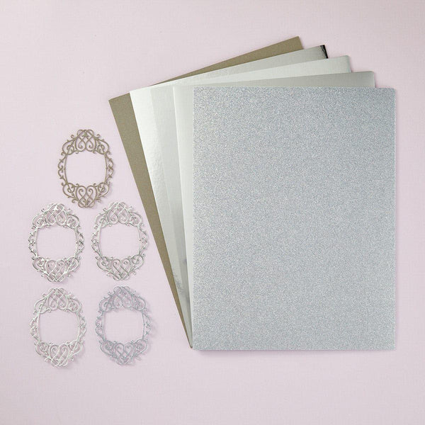 When you love all sorts of specialty shiny papers, this Silver Assortment Treasured Cardstock has it all! The pack of 15 premium cardstock sheets includes three sheets each of glitter metallic (100 lb), matte metallic (85 lb), brushed metallic (85 lb), mirror metallic (85 lb), and pearl metallic (92 lb) in beautiful tones of silver. Use this treasure trove of specialty metallic cardstock for your die-cutting, embossing folder and card layering needs. Add sparkle in your projects for scrapbooking, cardmaking and beyond!