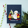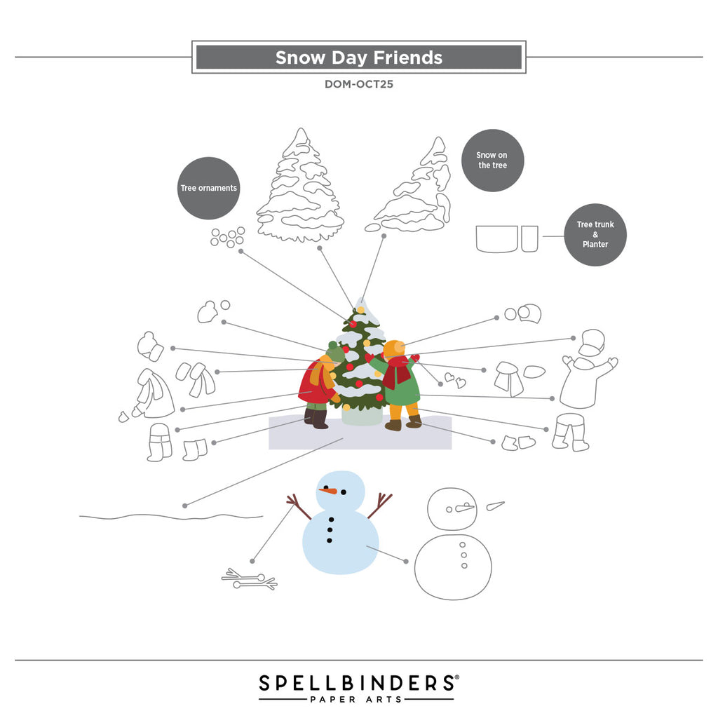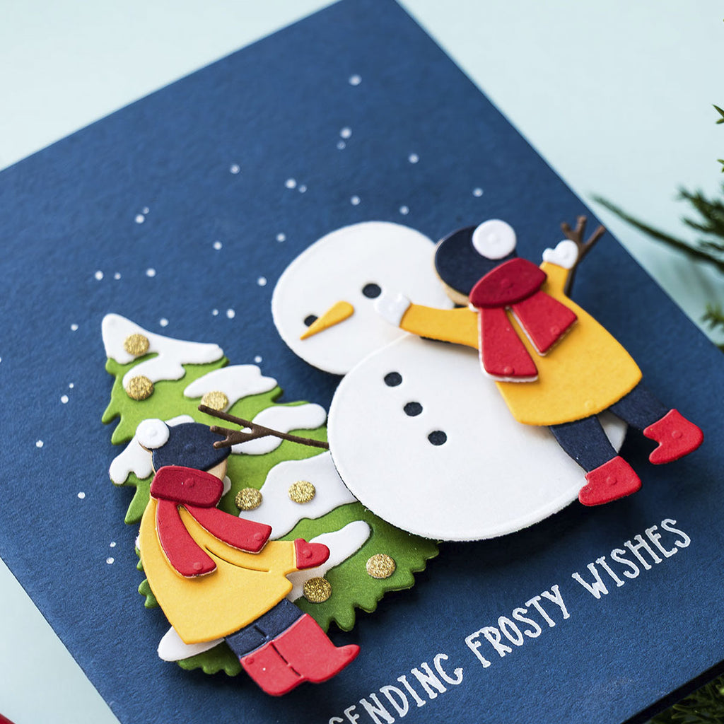 Celebrate the joy of winter crafting with the Snow Day Friends Die Set! This delightful collection features two bundled-up friends decorating a snow-covered tree and building a cheerful snowman.