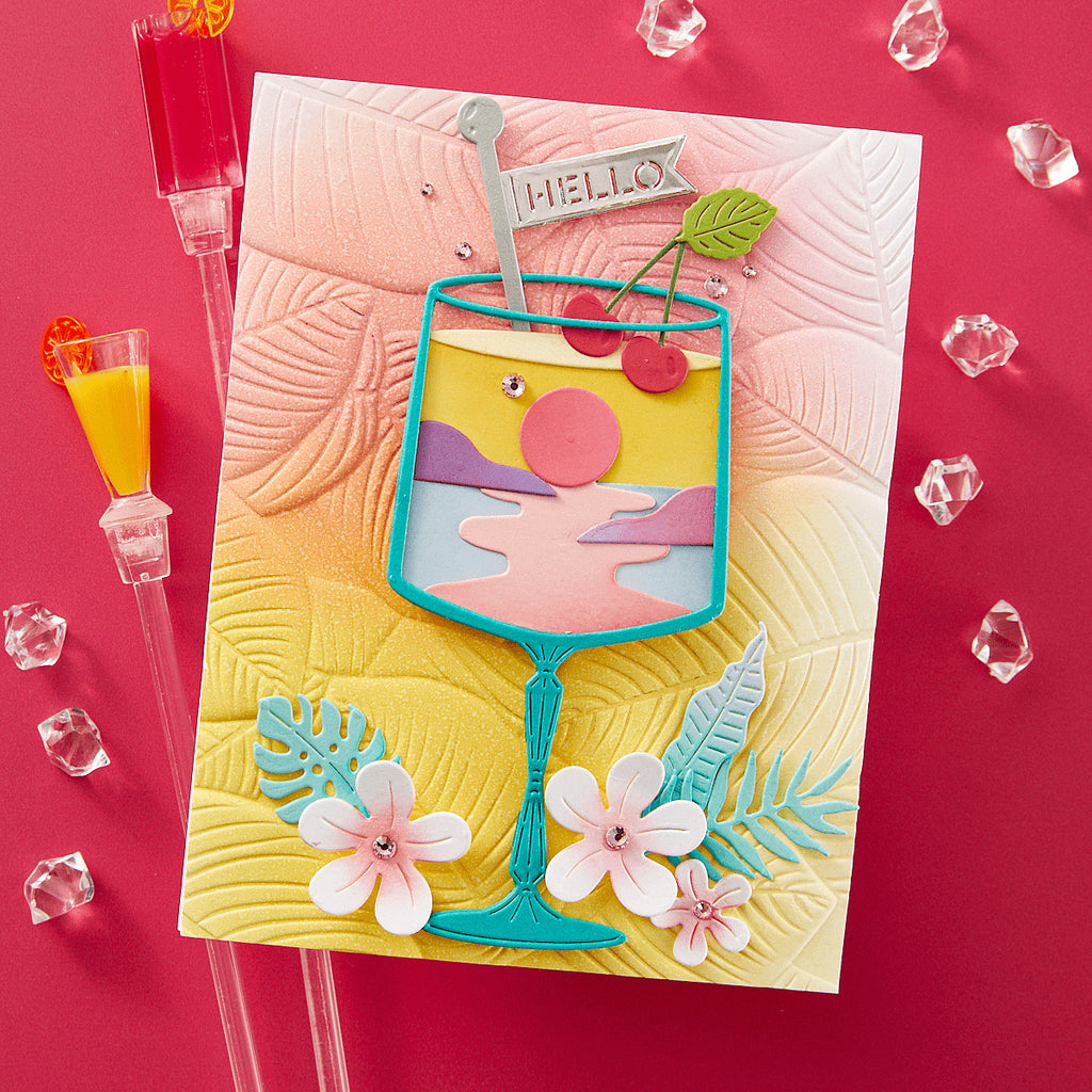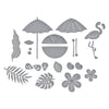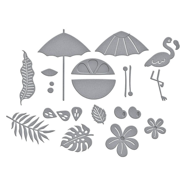 Tropical Flair Etched Dies are part of the Happy Hour Collection. This set of 15 thin metal cutting dies have so many fun designs for everything tropical! It includes florals, leaves, flamingo, citrus and even an umbrella to add to drinks! Mix and match with the other sets in the collection for a festive vibe!