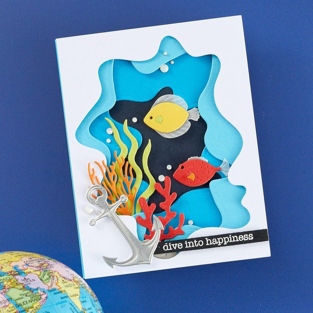 Underwater Tunnel Etched Dies are from the Tunnel Scapes Collection by Vicky Papaioannou. Create a wonderful and mysterious tunnel that can be by the ocean or deep into the ocean with this set of nine thin metal cutting dies. Each layer can be popped up with foam to make a wonderful and dimensional three-layer tunnel.