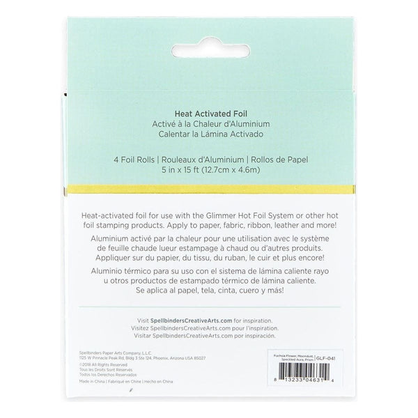 Glimmer Hot Foil 4 Rolls - Spellbound Variety Pack comes in four different colors. Each roll is 15-foot with a width of 5-inches. Colors include: Fuchsia Flower, Moondust, Speckled Aura and Prism.