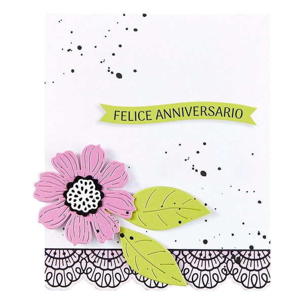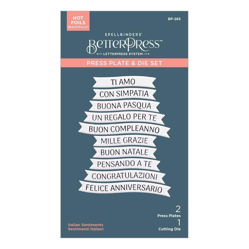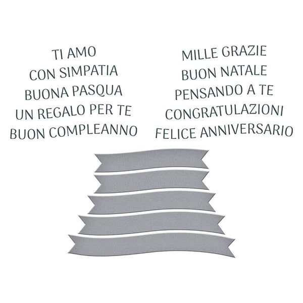 Italian Sentiments BetterPress Plate & Die Set is from the International Sentiments Collection. Each of the two plates press five Italian sentiments at once, perfect for cutting out with the matching thin metal cutting die for a time-saving step. The sentiment strips are cut into waving ribbon-tail ends on both sides to create movement. There’s a total of 10 sentiments to choose from. The uppercase font sentiments cover many occasions such as Grazie/Thank You, Natale/Christmas, Pensando/Thinking, Congratulazioni/Congratulations, Anniversario/Anniversary, Ti Amo/I love You, Simpatia/Sympathy, Pasqua/Easter, Regalo/Gift and Compleanno/Birthday. Ink the plates with the BetterPress Ink to be pressed against the BetterPress Cotton Card Panel and Sheets for a crisp letterpress design.