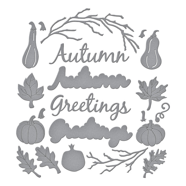 Autumn Greetings Wreath Etched Dies are from the Texture & Foliage Collection by Suzanne Hue. The set of 13 thin metal cutting dies creates a wonderful grapevine wreath with many accents and an Autumn Greetings sentiment. Makes a perfect focal point for any fall-themed projects.