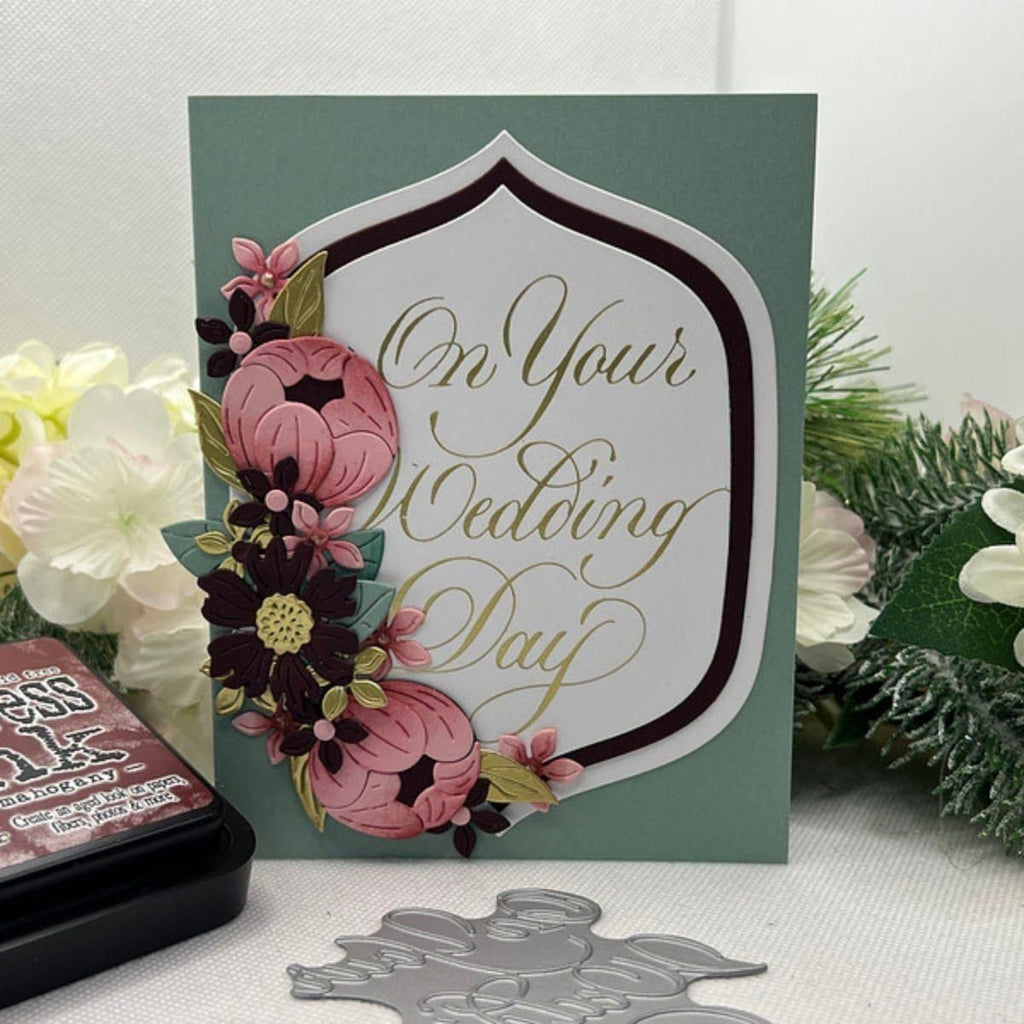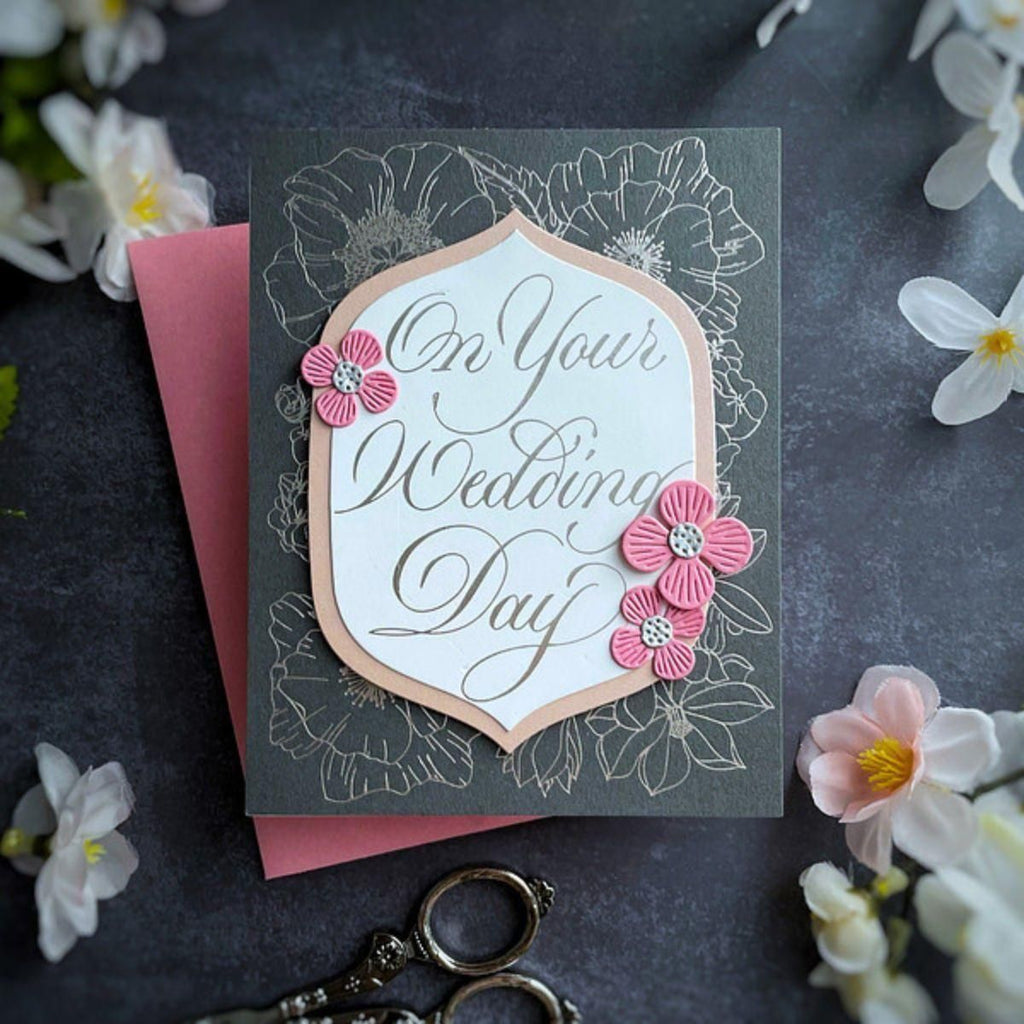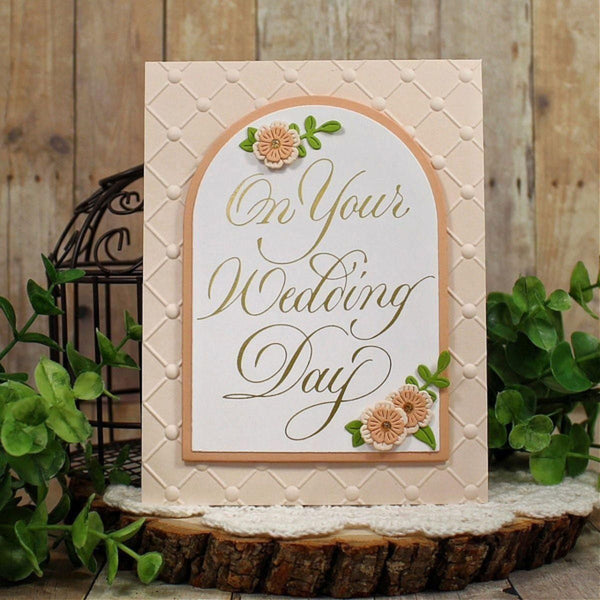 Copperplate On Your Wedding Day BetterPress Plate is from the Copperplate On Your Wedding Day Collection by Paul Antonio. This plate presses On Your Wedding Day in an elegant Copperplate script onto your creation, and perfect for the occasion! Ink the plates with the BetterPress Ink to be pressed against the BetterPress Cotton Card Panel and Sheets for a crisp letterpress design.