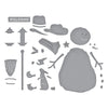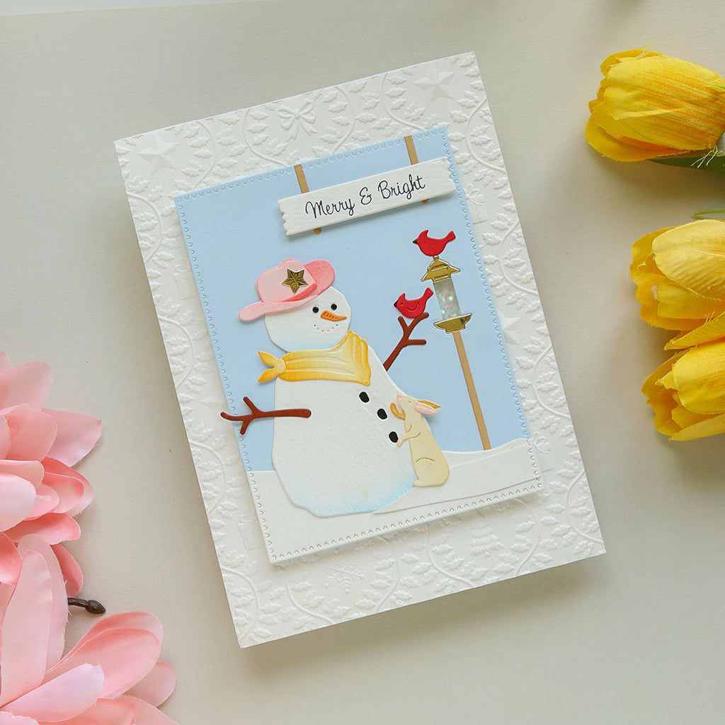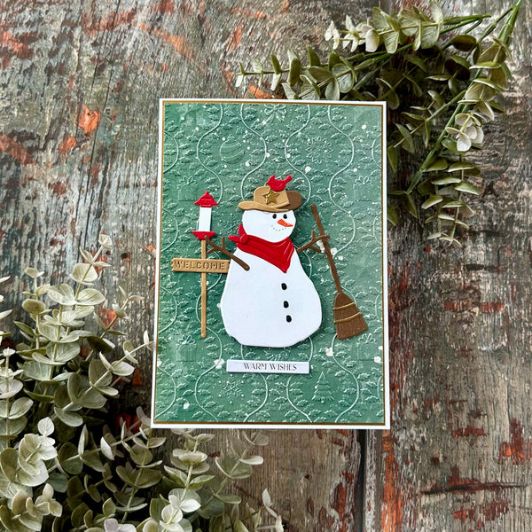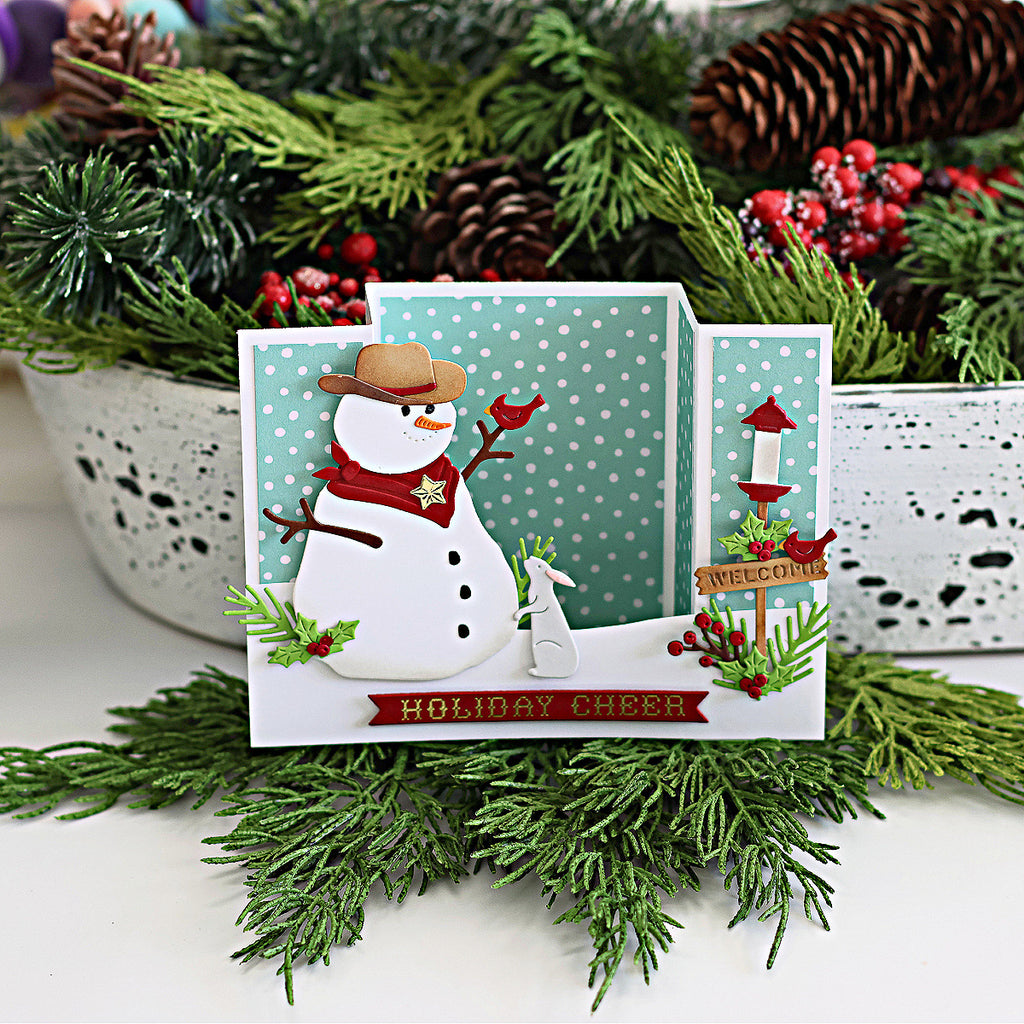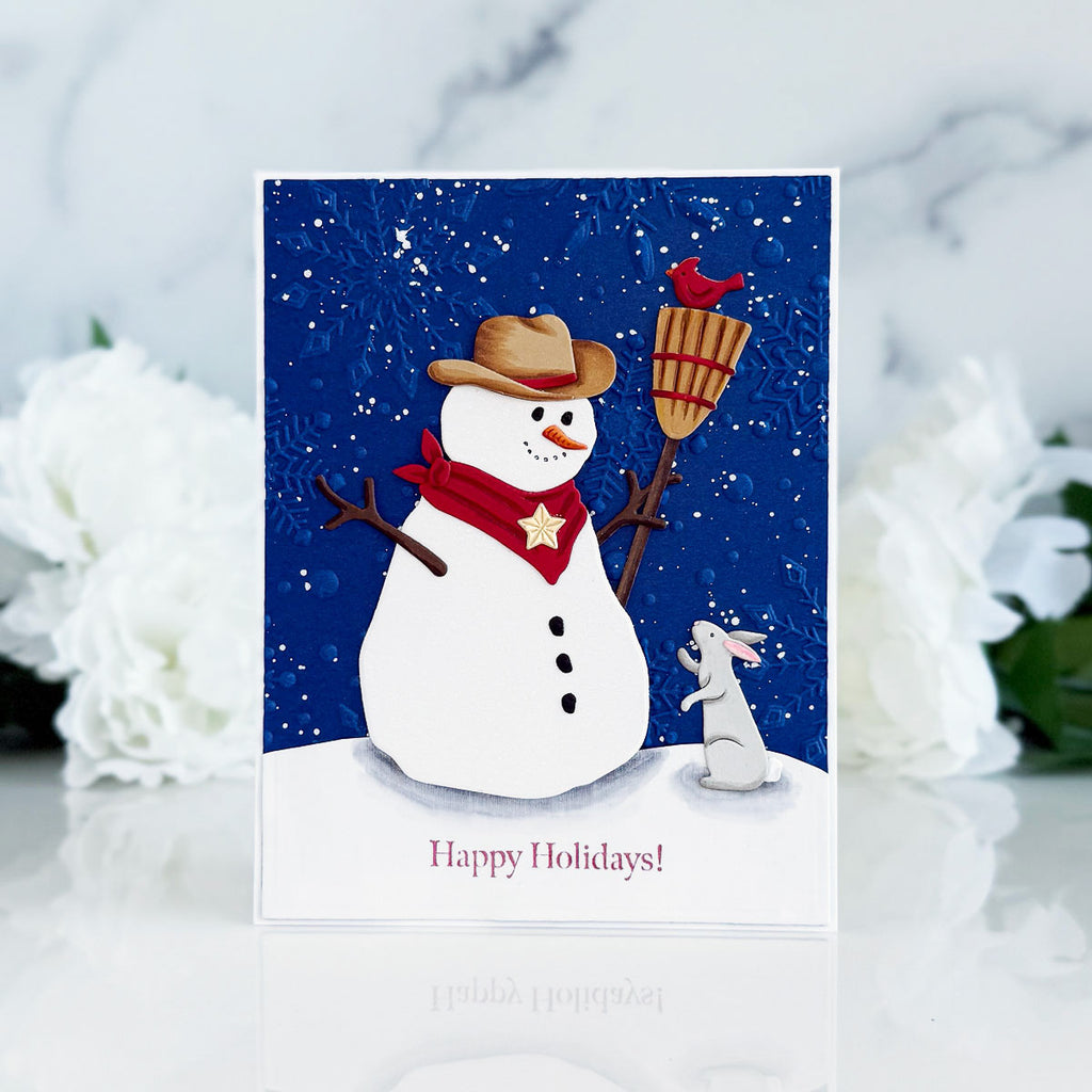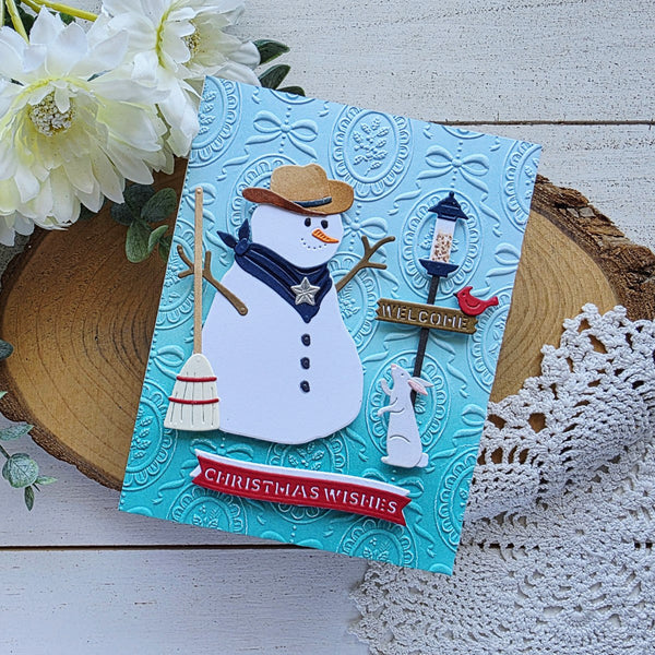 Country Snowman Etched Dies are part of the Country Christmas Collection by Annie Williams This set of 20 thin metal cutting dies creates a sweet snowman with accessories to add to a scenery to two. It includes a cowboy hat, bird feeder ensemble, a welcome sign, an adorable bunny and more!